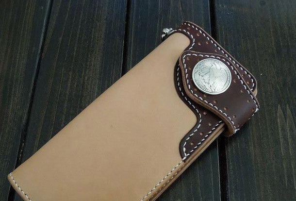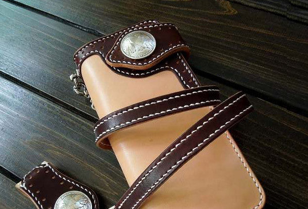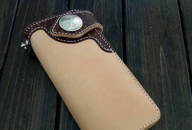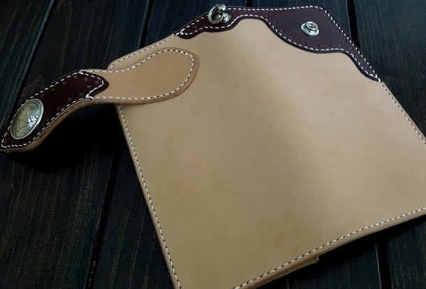 This is handmade natural Italian Vegetable Tanned leather ?beige coffee leather biker wallet chain bifold Long wallet purse for men.The wallet is bifold,color i