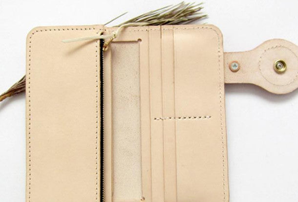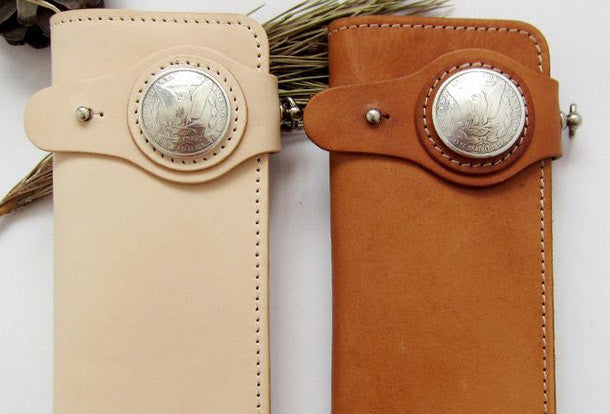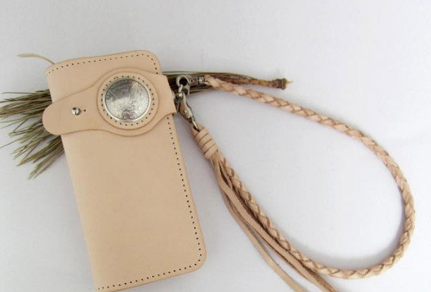This is handmade men beige tan natural Italian Vegetable Tanned leather long biker wallet with chain purse clutch for men.The wallet is bifold,color is beige,tan.There are 3?full size bill slots/holders, 8?ID/credit card slots/holders,1 zip coin change slot~Hand-made in the traditional method with punched holes and saddle stitching by hand.