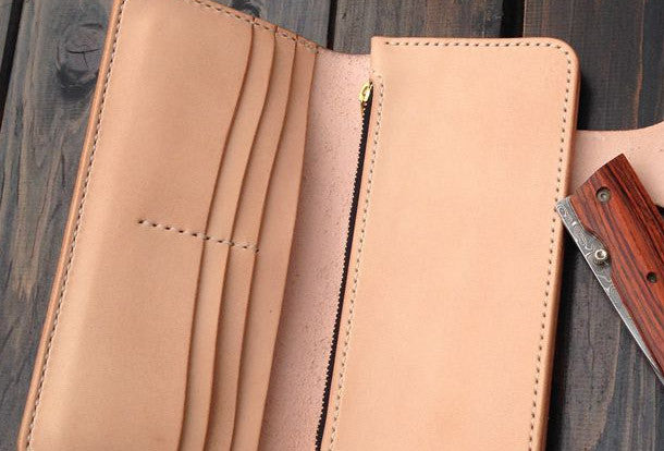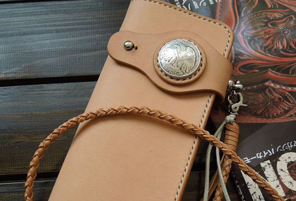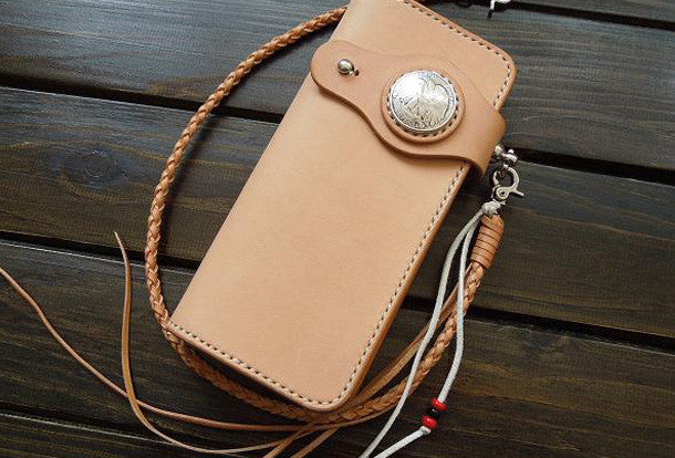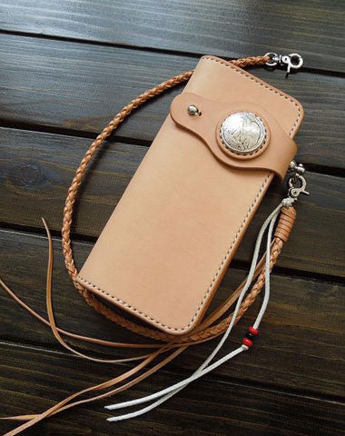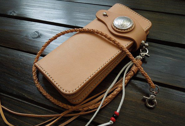 This is handmade natural Italian Vegetable Tanned leather long biker wallet for men/women.The wallet is bifold,color is beige.A floral button/? vintage icon?as its lock catch~Hand-made in the traditional method with punched holes and saddle stitching by hand.