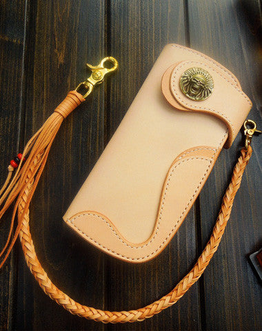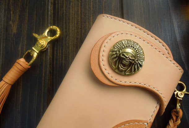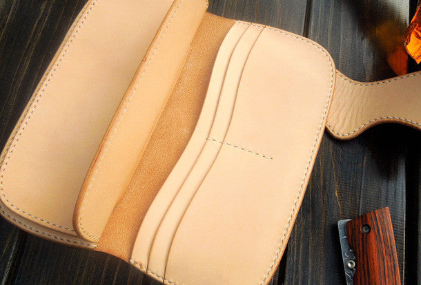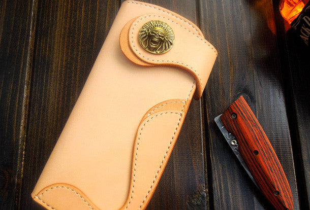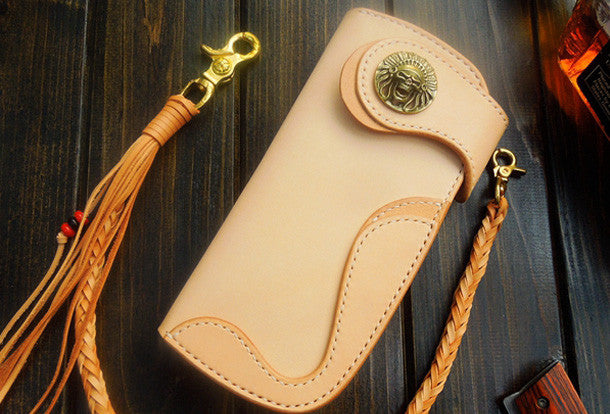 This is handmade natural Italian Vegetable Tanned leather long biker wallet for men/women.The wallet is bifold,color is beige.There are 2 full size bill slots/holders,4 ID/credit card slots/holders,?1 zip coin slot/holder and a floral button /?vintage icon?as its lock catch~Hand-made in the traditional method with punched holes and saddle stitching by hand.