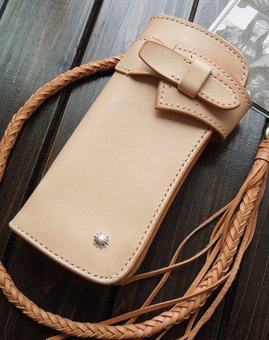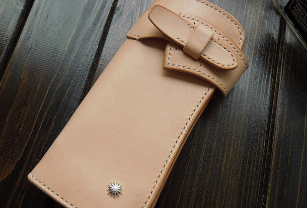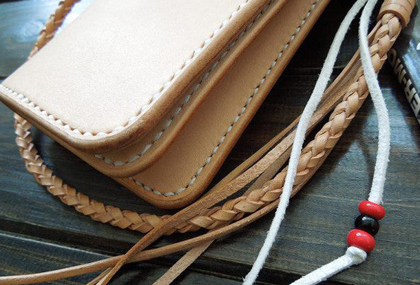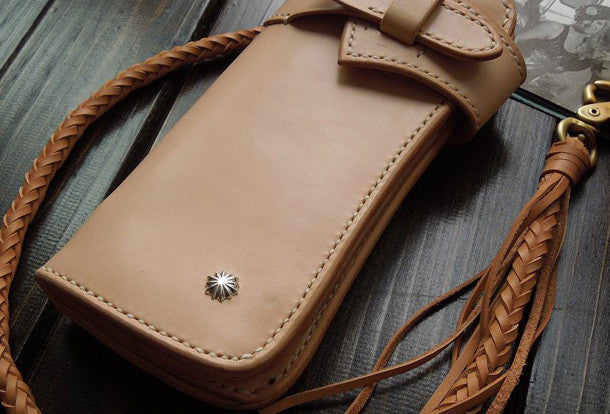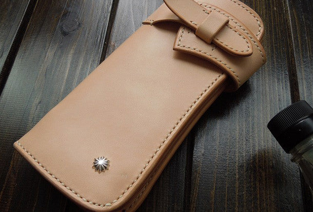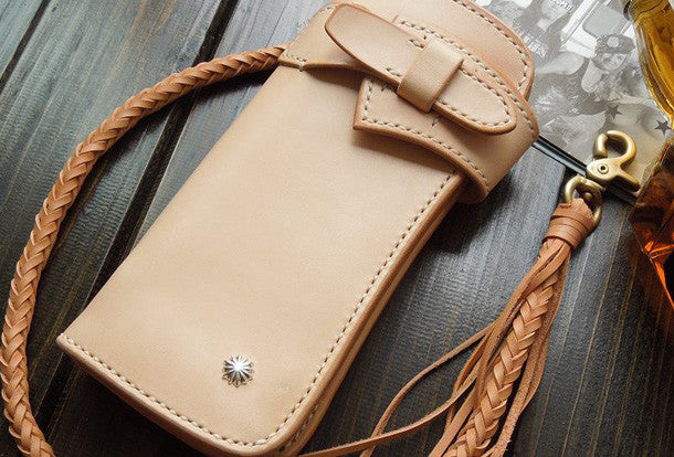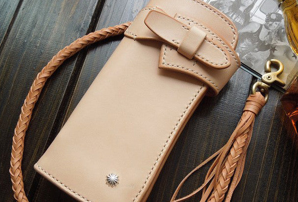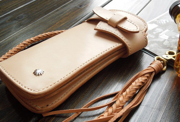 This is handmade natural Italian Vegetable Tanned leather long biker wallet for men/women.The wallet is bifold,color is beige.A floral button/? vintage icon?as its lock catch~Hand-made in the traditional method with punched holes and saddle stitching by hand.