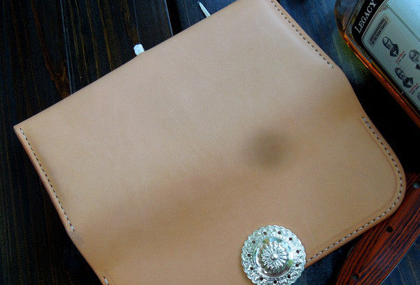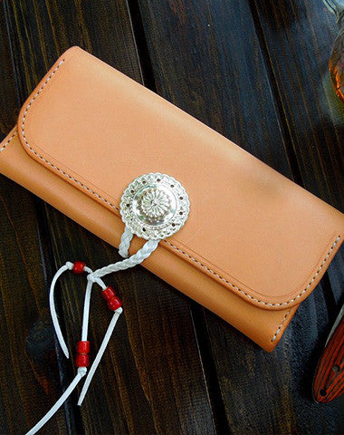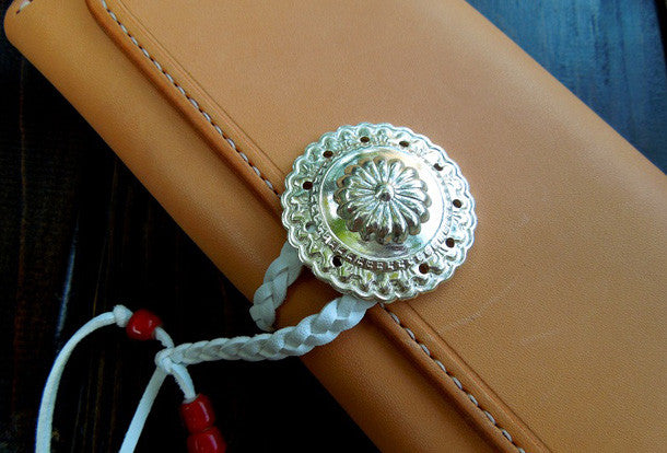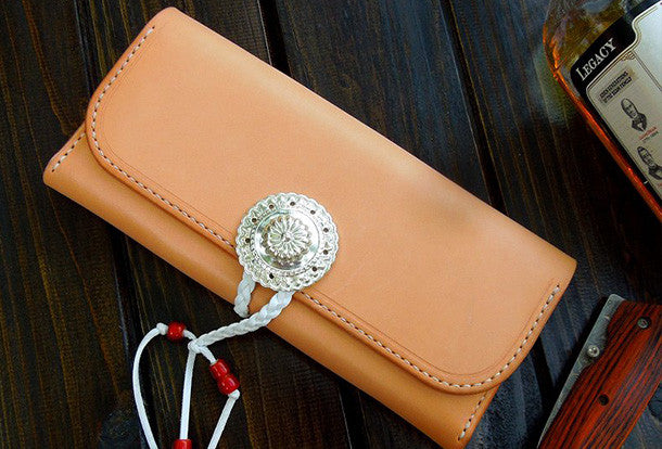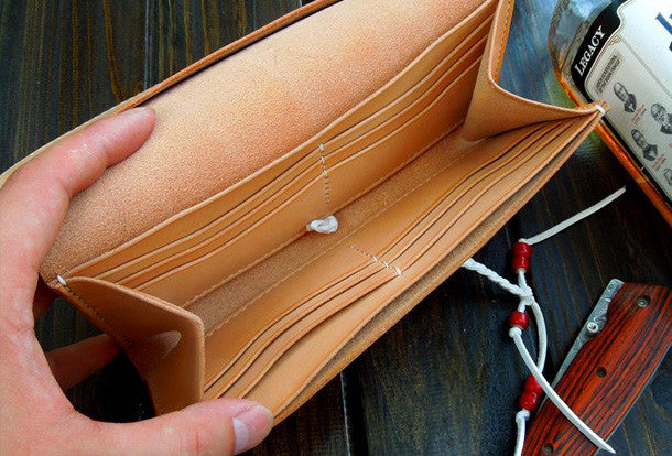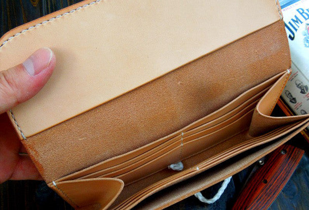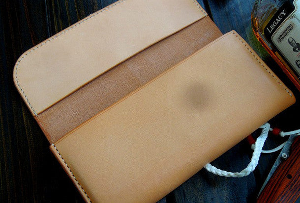 This is handmade natural Italian Vegetable Tanned leather long biker wallet for men/women.The wallet is bifold,color is beige.There are 3 full size bill slots/holders, 12 ID/credit card slots/holders,and a floral button as its lock catch~Hand-made in the traditional method with punched holes and saddle stitching by hand.