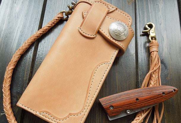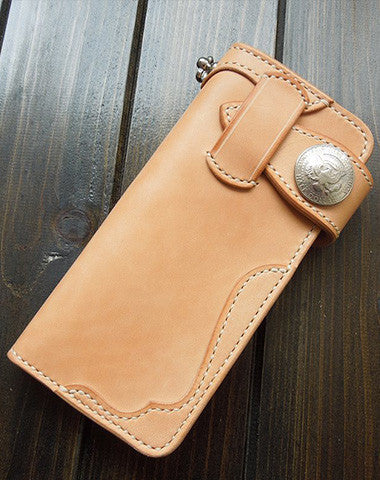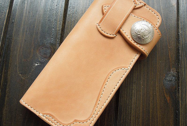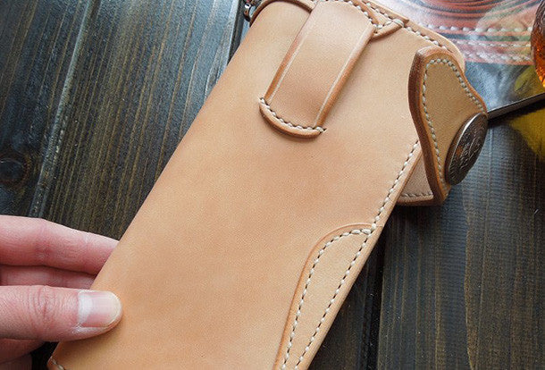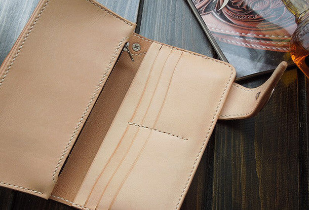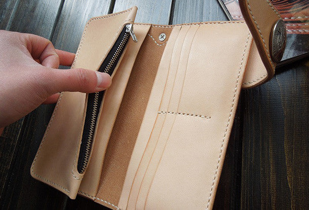 This is handmade natural Italian Vegetable Tanned leather long biker wallet for men/women.The wallet is bifold,color is beige.There are 2 full size bill slots/holders, 6 ID/credit card slots/holders, 1 zip coin slot/holder,and a vintage american icon as its lock catch~Hand-made in the traditional method with punched holes and saddle stitching by hand.