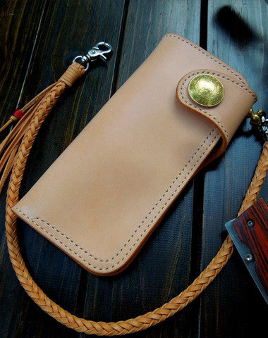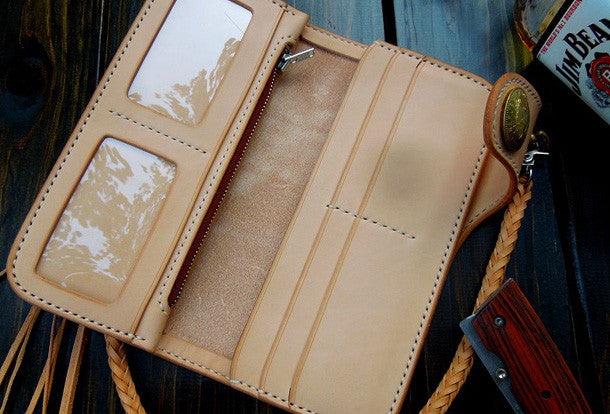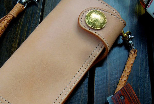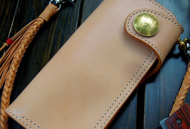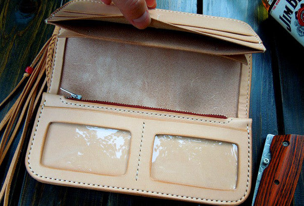 This is handmade natural Italian Vegetable Tanned leather long biker wallet for men/women.The wallet is bifold,color is beige.There are 1 full size bill slots/holders,4 ID/credit card slots/holders,?1 zip coin slot/holder,2 photo holder?and a floral button ?/? vintage icon?as its lock catch~Hand-made in the traditional method with punched holes and saddle stitching by hand.