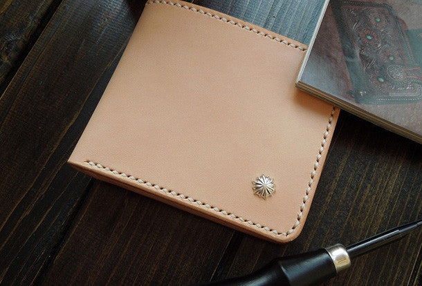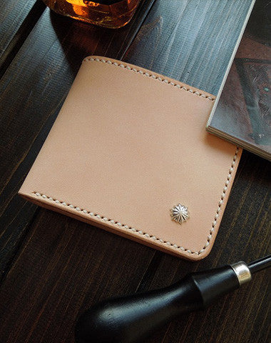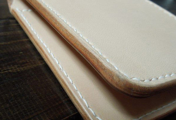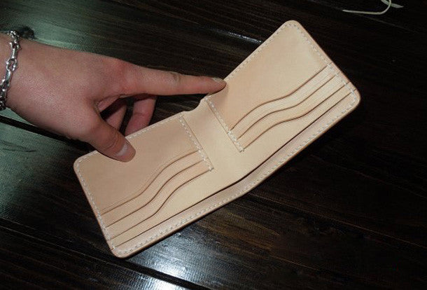 This is handmade natural Italian Vegetable Tanned leather? billfold biker wallet for men.The wallet is bifold,color is beige.There are 1 full size bill slots/holders, 6 ID/credit card slots/holders~Hand-made in the traditional method with punched holes and saddle stitching by hand.
