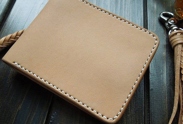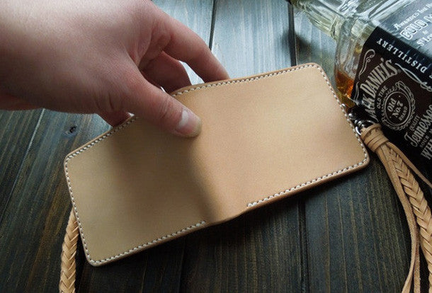 This is handmade natural Italian Vegetable Tanned leather? billfold biker wallet for men.The wallet is bifold,color is beige.There are 1 full size bill slots/holders, 6 ID/credit card s
