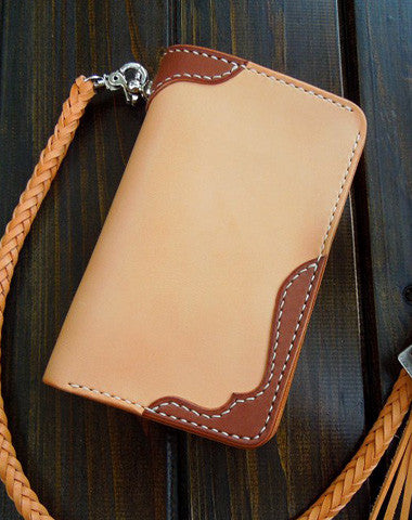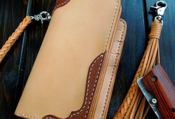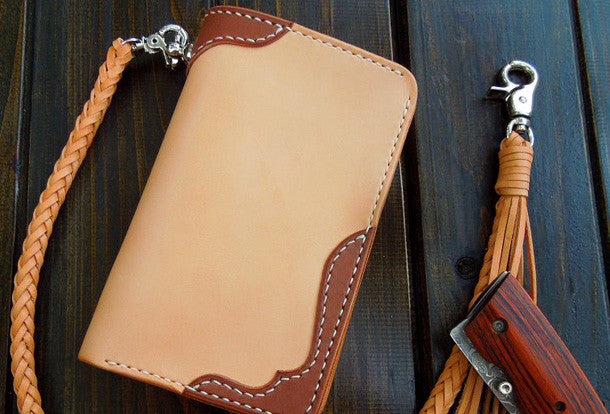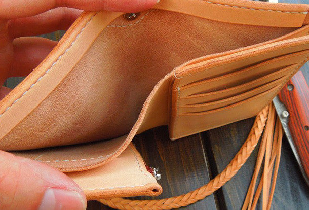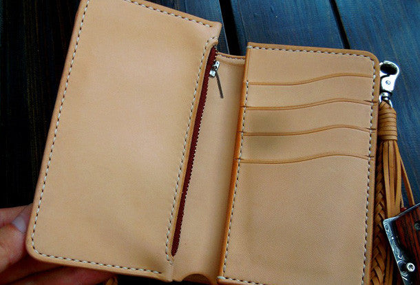 This is handmade natural Italian Vegetable Tanned leather? billfold biker wallet for men/women.The wallet is bifold,color is beige.There are 1 full size bill slots/holders, 4 big ID/credit card slots/holders, 1 big zip coin slot/holder~Hand-made in the traditional method with punched holes and saddle stitching by hand.