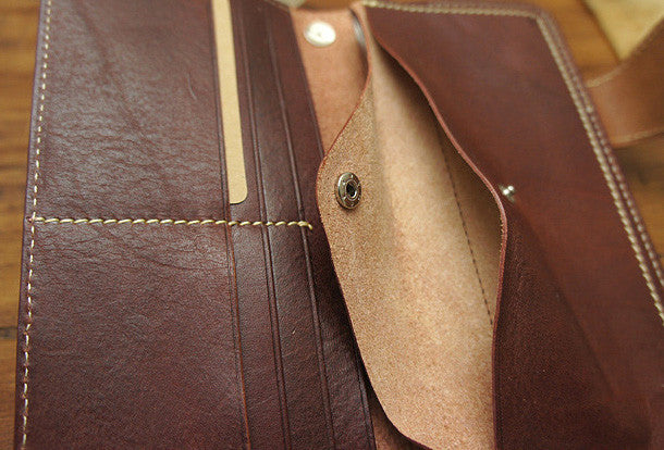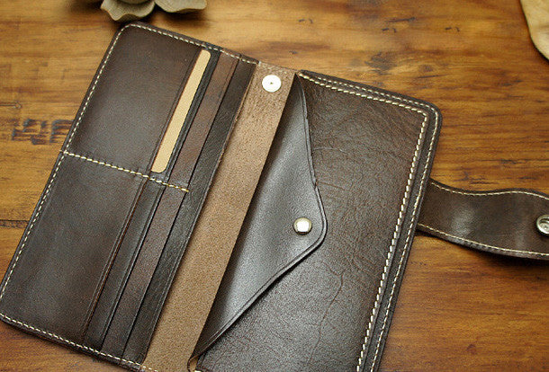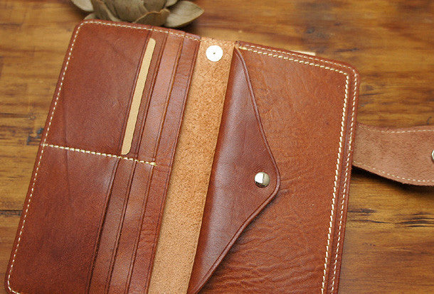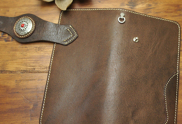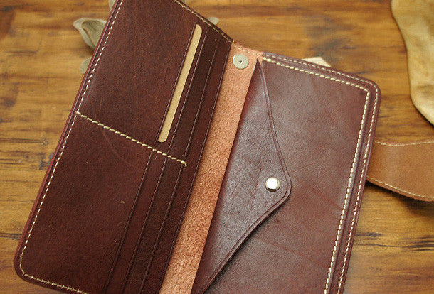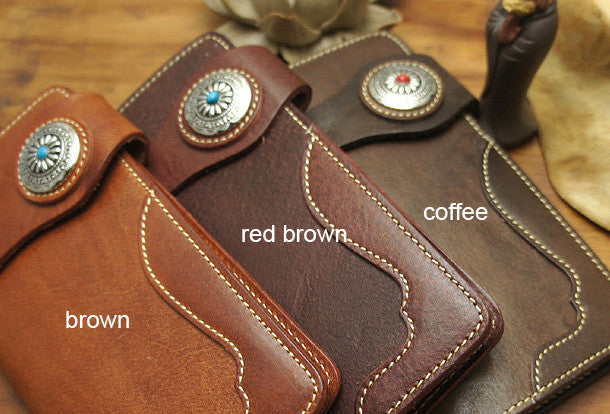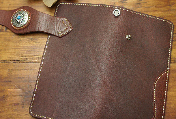 This is handmade biker leather wallet natural Italian Vegetable Tanned leather long brown coffee biker wallet with chain purse clutch for men.The wallet is bifold,color is red brown,coffee,brown.There are 2?full size bill slots/holders, 6?ID/credit card slots/holders, 1 zip coin phone slot/holder~Hand-made in the traditional method with punched holes and saddle stitching by hand.