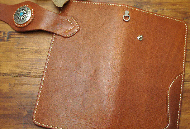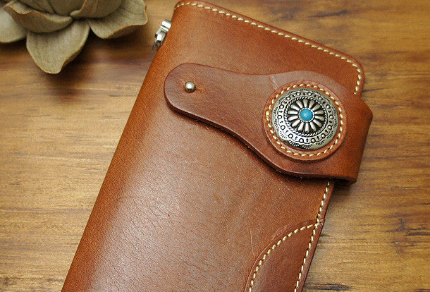 This is handmade biker leather wallet natural Italian Vegetable Tanned leather long brown coffee biker wallet with chain purse clutch for men.The wallet is bifo