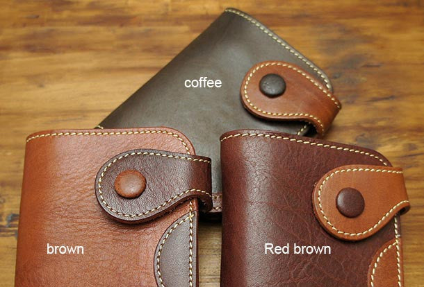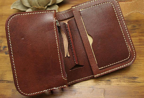 This is handmade biker leather wallet natural Italian Vegetable Tanned leather?billfold?coffee red?brown with chain purse clutch for men.The wallet is bifold,color is coffee,brown,red brown.There are 1?full size bill slots/holders, 1?ID/credit card slots/holders, 1 zip coin phone slot/holder~Hand-made in the traditional method with punched holes and saddle stitching by hand.