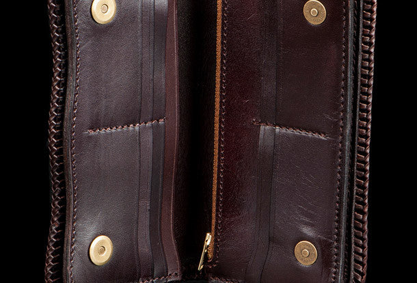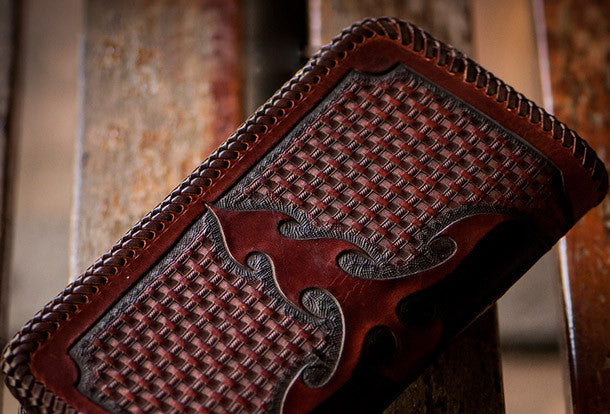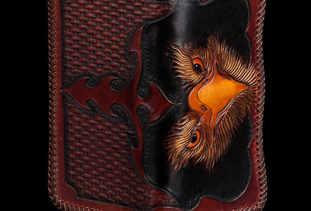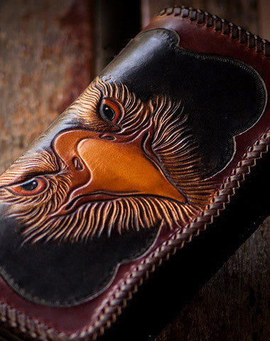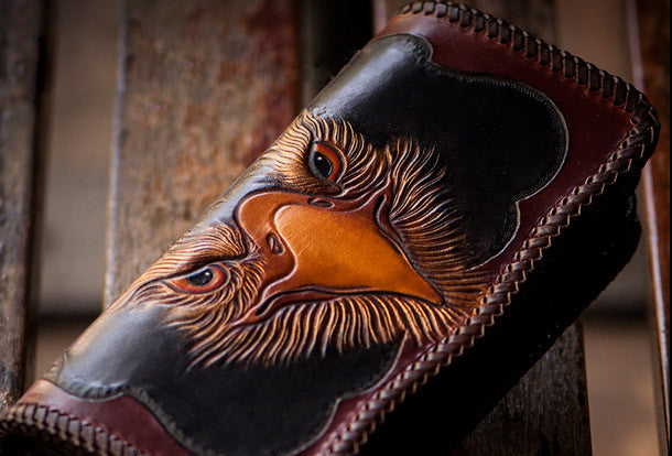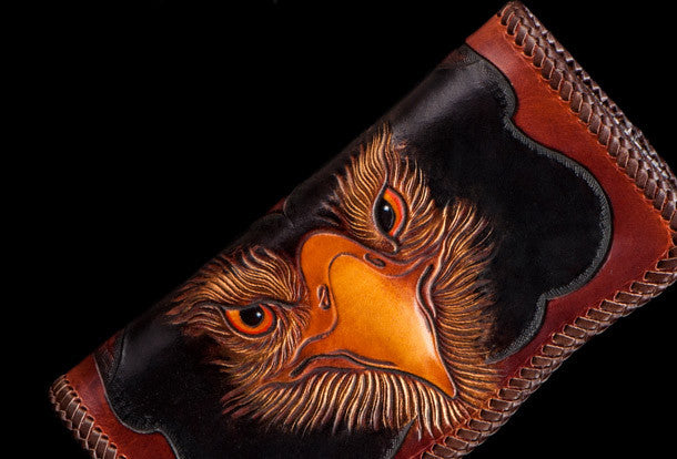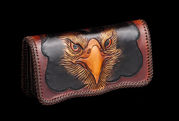 This is handmade black?brown natural Italian Vegetable Tanned leather?long floral eagle?carved biker wallet purse clutch for men.The wallet is bifold,color is black & red?brown.There are 1?full size bill slots/holders, 10?ID/credit card slots/holders,1?coin change slot,1 zip slot~Hand-made in the traditional method with punched holes and saddle stitching by hand.