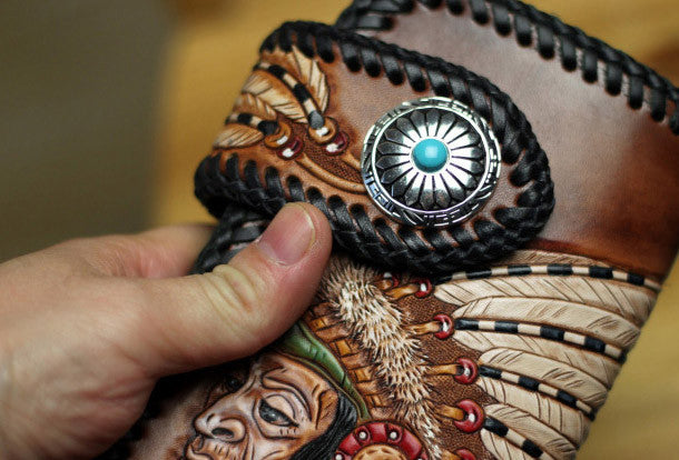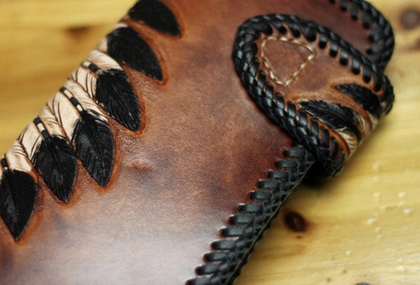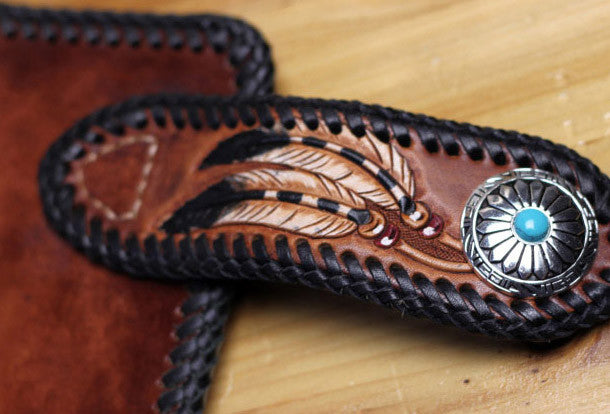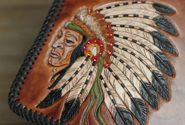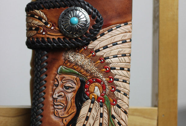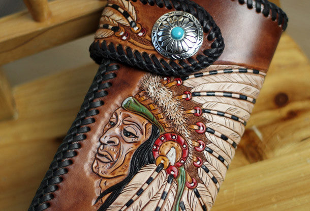 This is handmade brown natural Italian Vegetable Tanned leather long Indian chief carved biker wallet chian purse clutch for men.The wallet is bifold,color is brown.There are 3 full size bill slots/holders,10 ID/credit card slots/holders,1 coin change slot~Hand-made in the traditional method with punched holes and saddle stitching by hand.