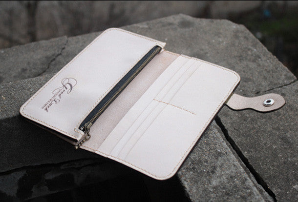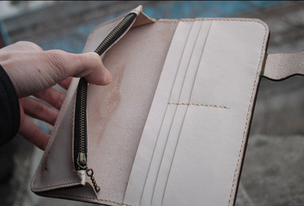 This is Handmade biker wallet leather vintage tan motorcycle leather long wallet for men.The wallet is bifold,color is tan.There are 2?full size bill slots/holders,6 ID/credit card slots/holders,1 zip checkbook coin change slot~Hand-made in the traditional method with punched holes and saddle stitching by hand.
