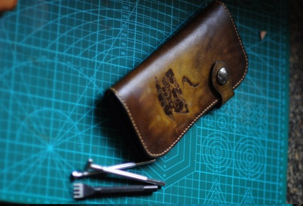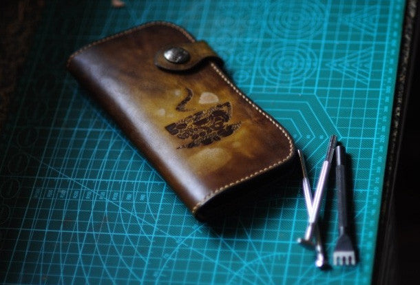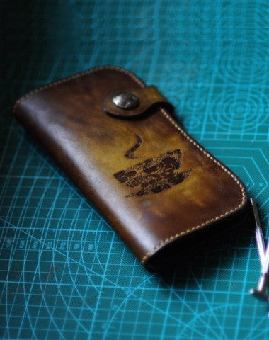 Handmade biker wallet leather carved coffee tan motorcycle leather wallet for men