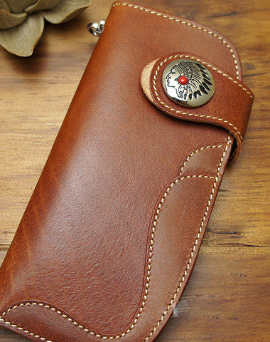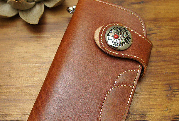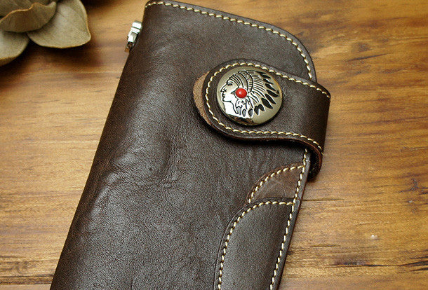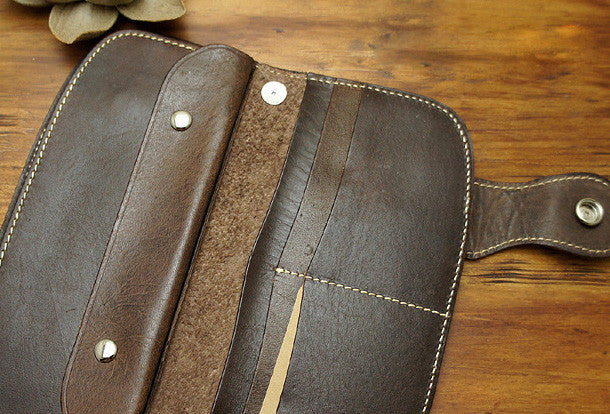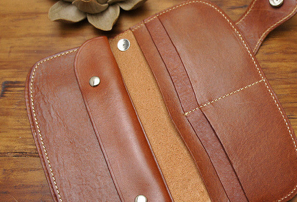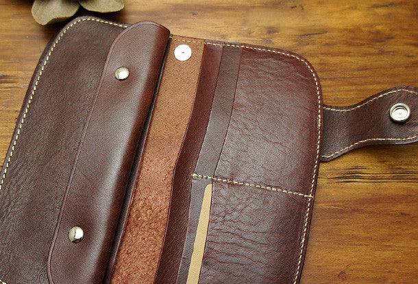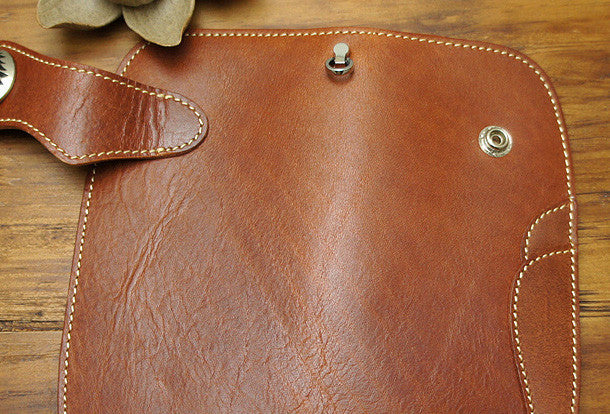 This is handmade natural Italian Vegetable Tanned leather long coffee red?brown biker wallet with chain purse clutch for men.The wallet is bifold,color is coffee,brown,red brown.There are 2?full size bill slots/holders, 4?ID/credit card slots/holders, 1 zip coin phone slot/holder~Hand-made in the traditional method with punched holes and saddle stitching by hand.