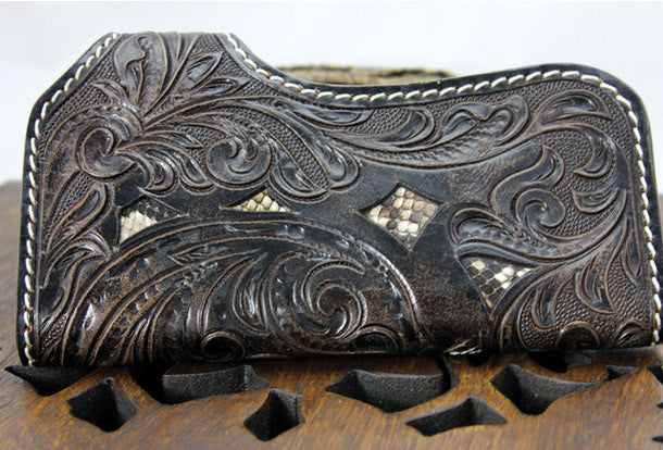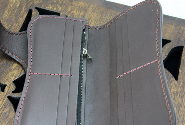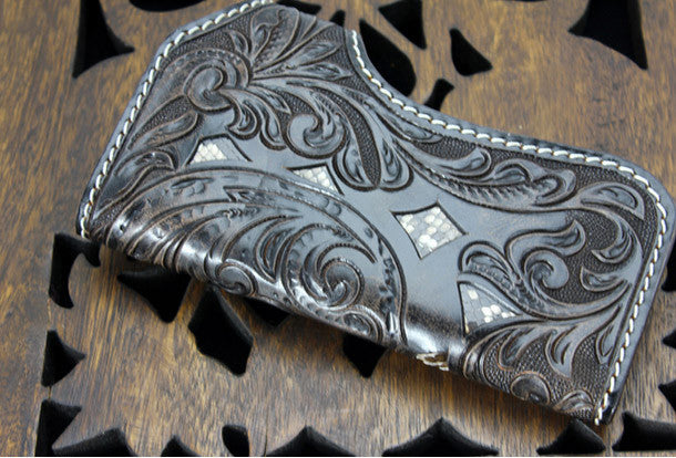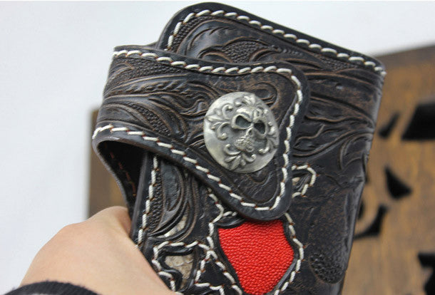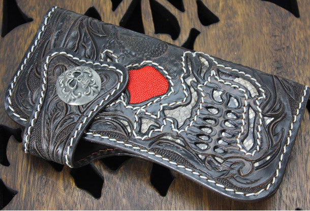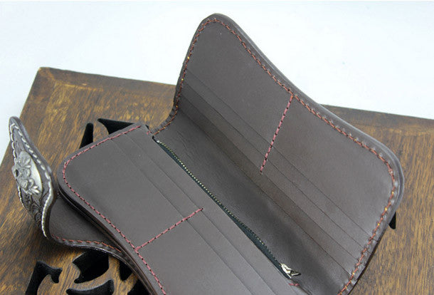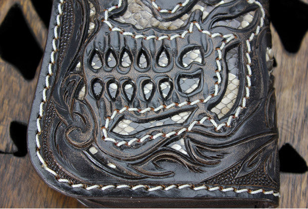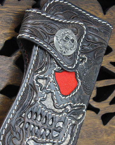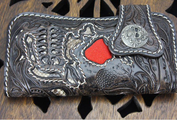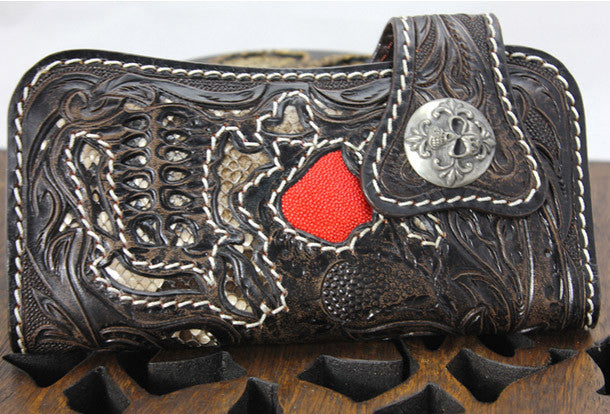 This is handmade black coffee?natural Italian Vegetable Tanned leather?snake skin?long ?punk?skull?carved biker wallet purse clutch for men.The wallet is bifold,color is black&coffee.There are 3?full size bill slots/holders, 10?ID/credit card slots/holders,1 zip coin change slot~Hand-made in the traditional method with punched holes and saddle stitching by hand.