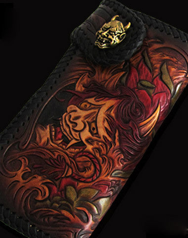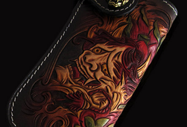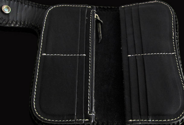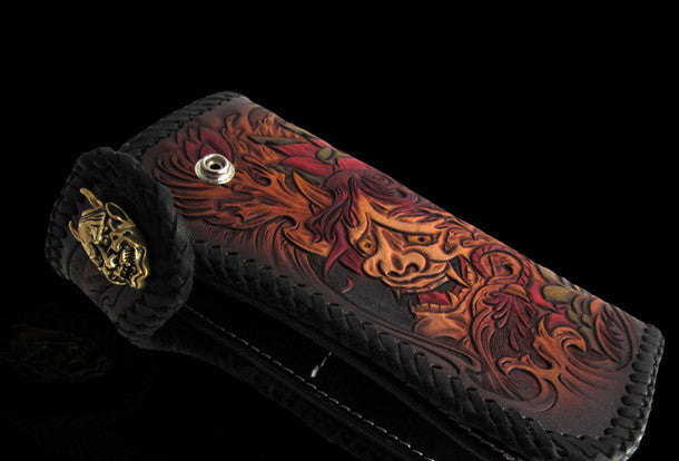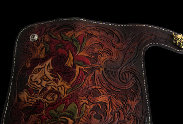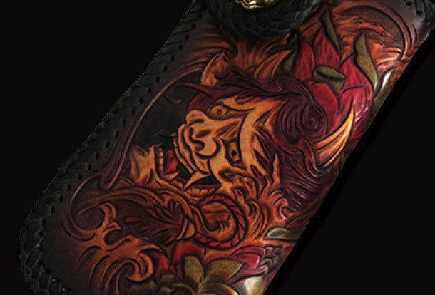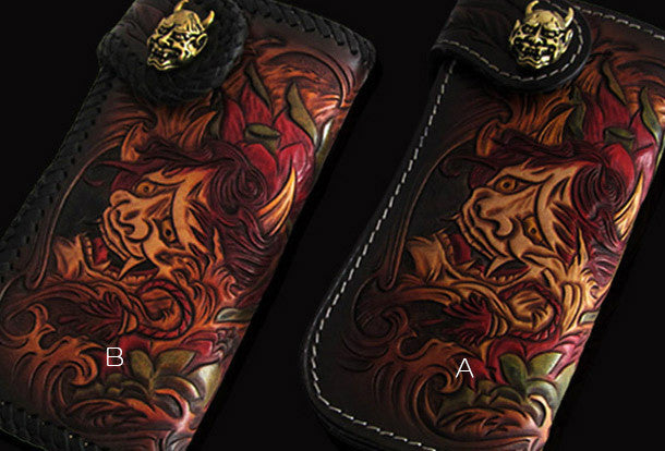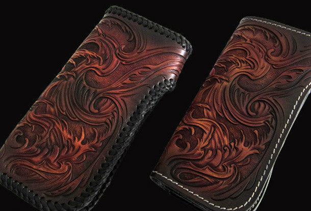 This is handmade brown color?natural Italian Vegetable Tanned leather long prajna carved biker wallet purse clutch for men.The wallet is bifold,color is black&color.There are 3?full