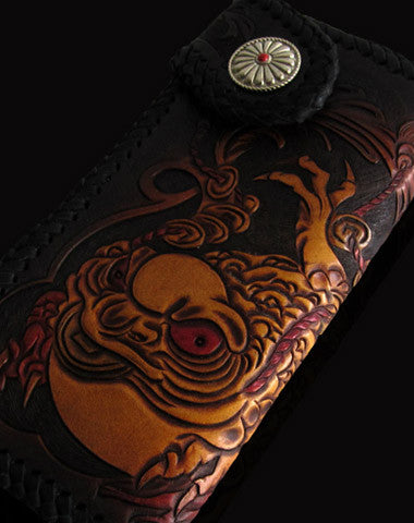 This is handmade black color?natural Italian Vegetable Tanned leather long toad carved biker wallet purse clutch for men.The wallet is bifold,color is black&color.There are 2?full si
