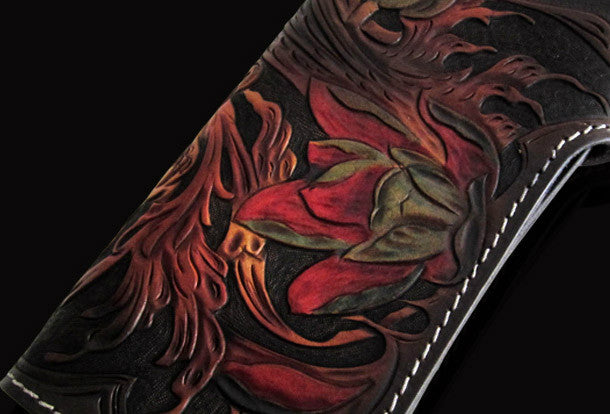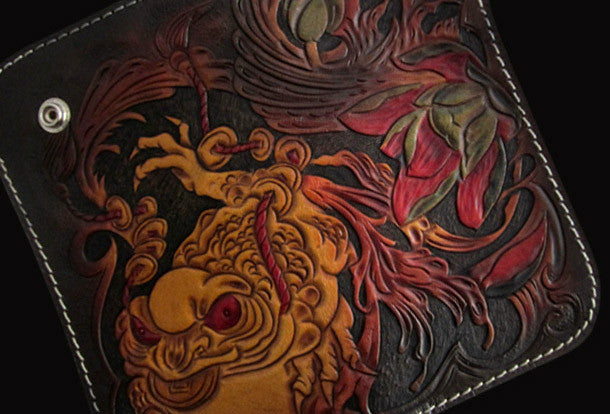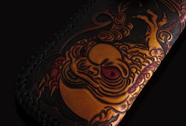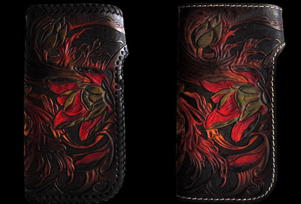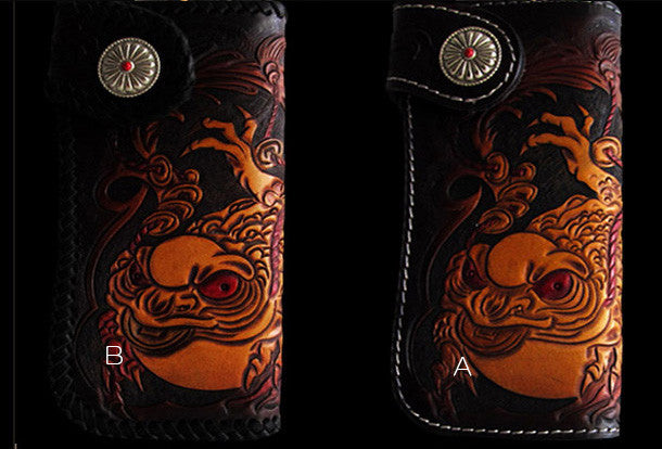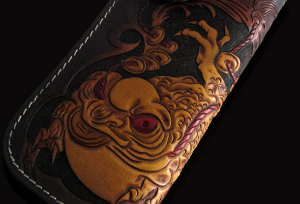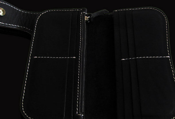 This is handmade black color?natural Italian Vegetable Tanned leather long toad carved biker wallet purse clutch for men.The wallet is bifold,color is black&color.There are 2?full size bill slots/holders, 10?ID/credit card slots/holders,1 zip coin change slot~Hand-made in the traditional method with punched holes and saddle stitching by hand.