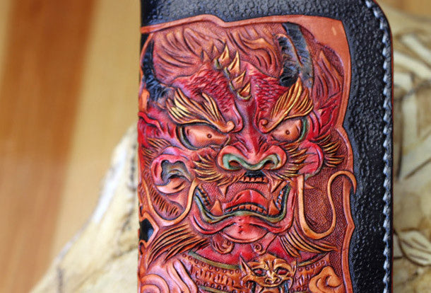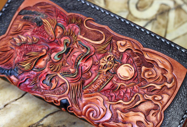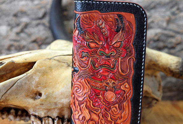 This is handmade black?natural Italian Vegetable Tanned leather long brave troops floral carved biker wallet chian?purse clutch for men.The wallet is bifold,color is black.There are 4?full size bill slots/holders, 12?ID/credit card slots/holders~Hand-made in the traditional method with punched holes and saddle stitching by hand.