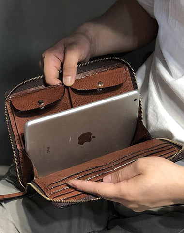 Style: Handmade Black Leather Mens Bifold Long Wallet Brown Multifunction Wallet IPAD Bag Card Holder Clutch Men
