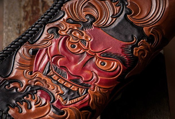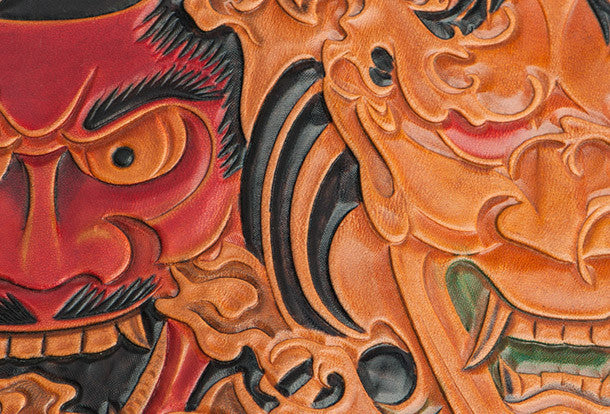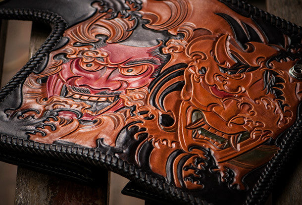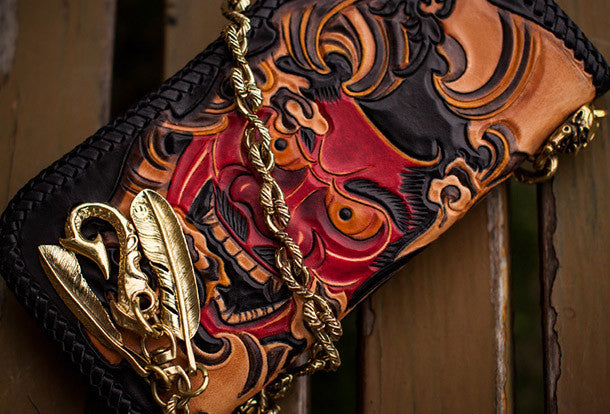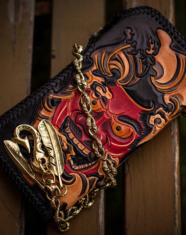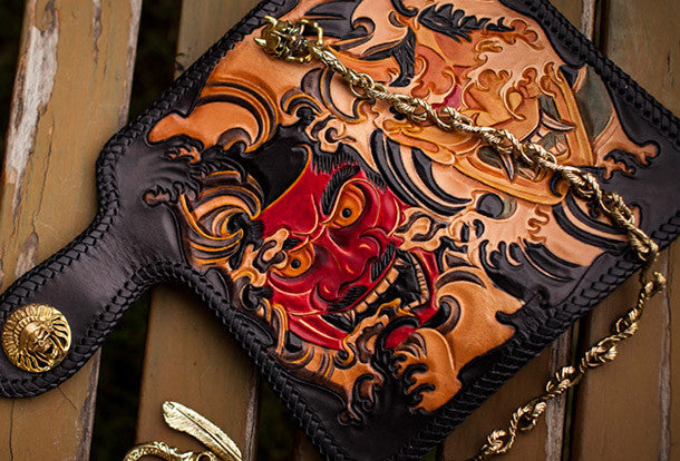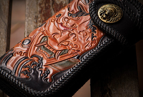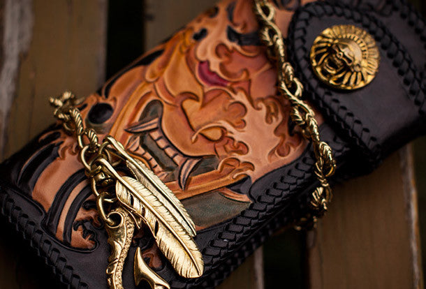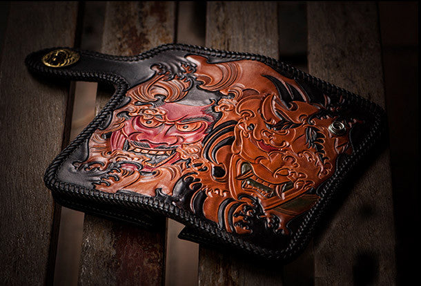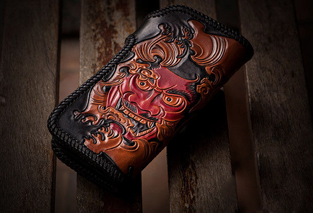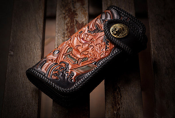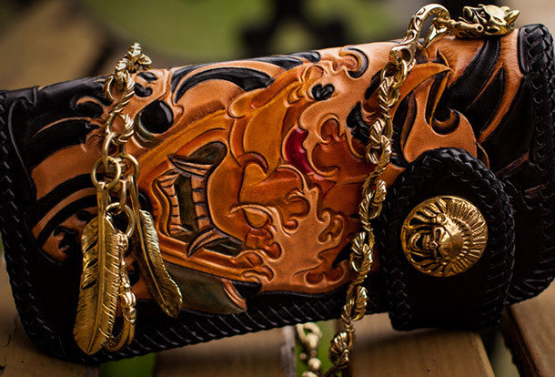 This is handmade black natural Italian Vegetable Tanned leather long?Prajna Plutus carved biker wallet purse clutch for men.The wallet is bifold,color is black.There are 1?full size bill slots/holders, 10?ID/credit card slots/holders,1 coin change slot~Hand-made in the traditional method with punched holes and saddle stitching by hand.