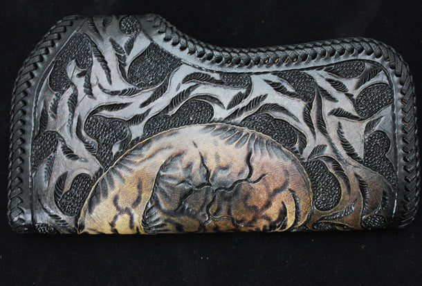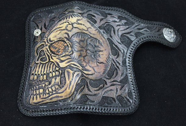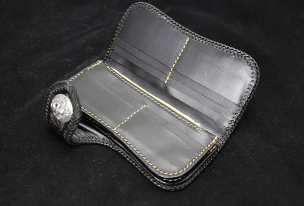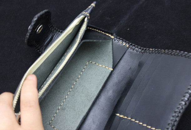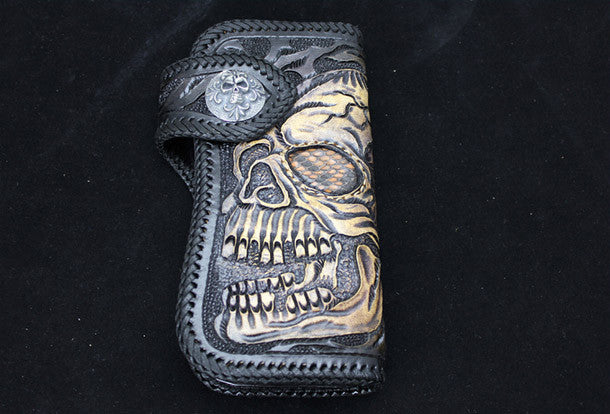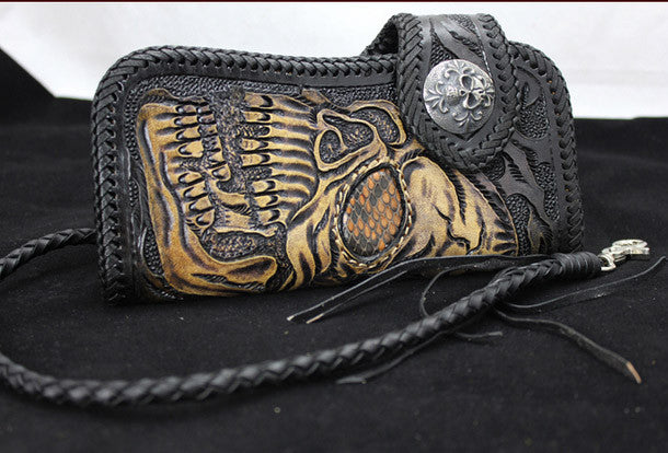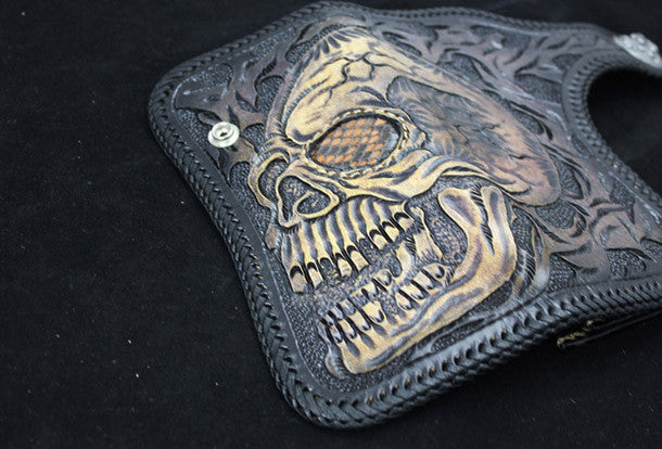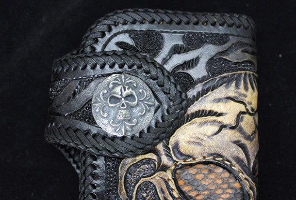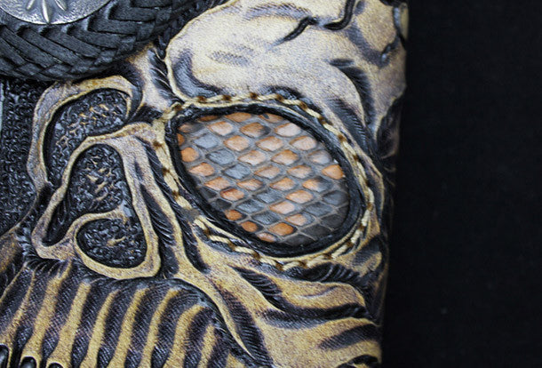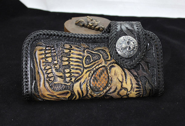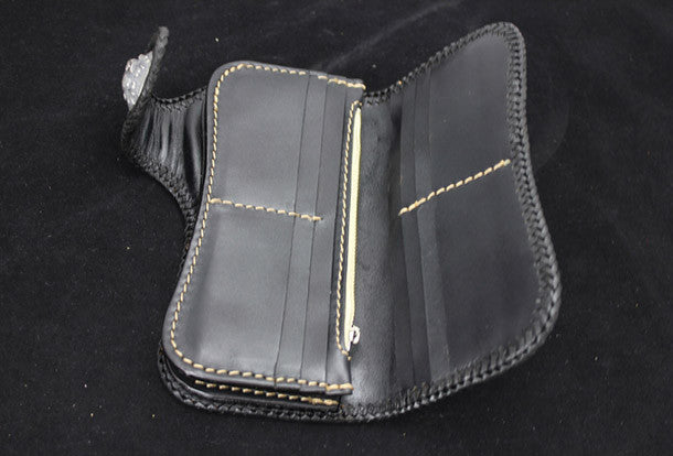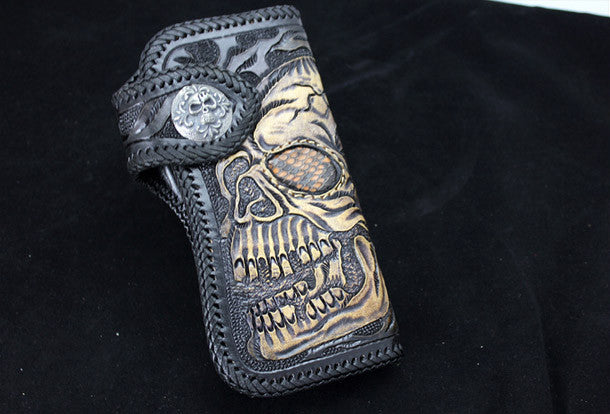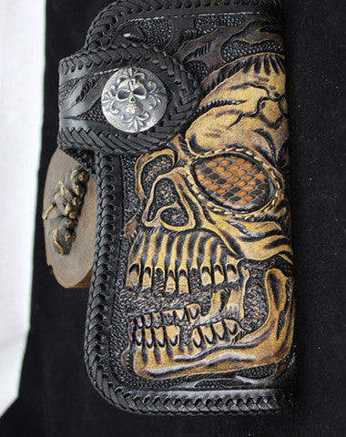 This is handmade black natural Italian Vegetable Tanned leather?snake skin?long Halley punk?skull?carved biker wallet purse clutch for men.The wallet is bifold,color is black.There are 3?full size bill slots/holders, 10?ID/credit card slots/holders,1 zip coin change slot~Hand-made in the traditional method with punched holes and saddle stitching by hand.