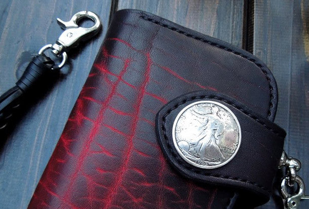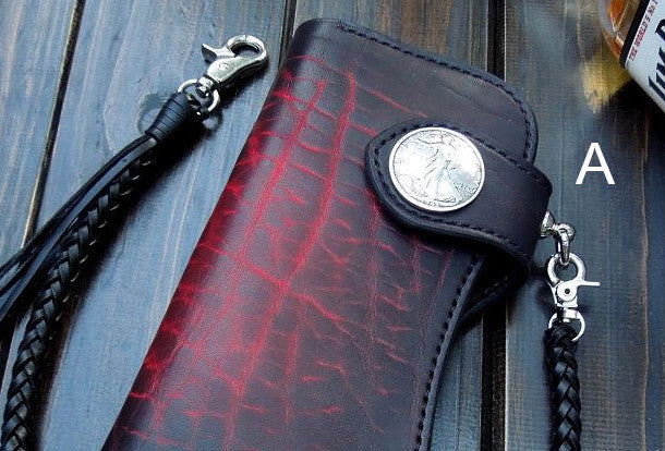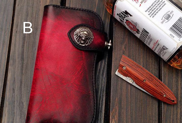 This is handmade natural Italian Vegetable Tanned leather black leather punk long biker wallet trucker wallet chain bifold long wallet for men.The wallet is bifold,color is black.There are 4 full size bill slots/holders,4 ID/credit card slots/holders, 1 zip coin slot/holder and a floral button / vintage icon as its