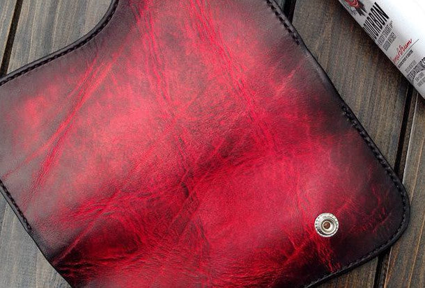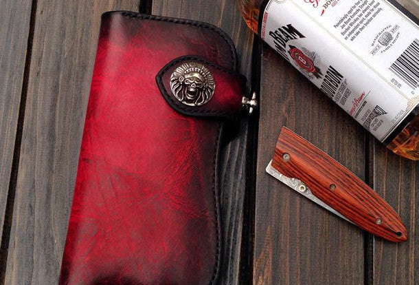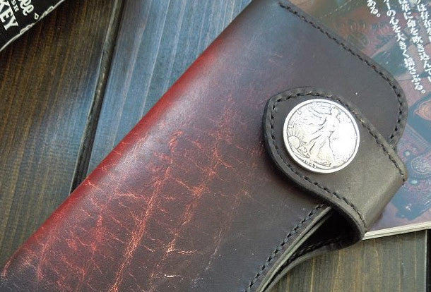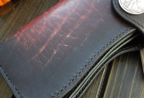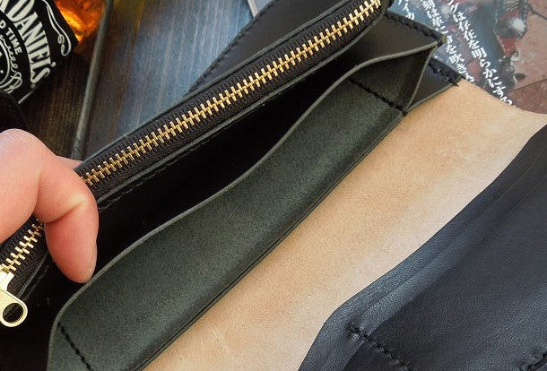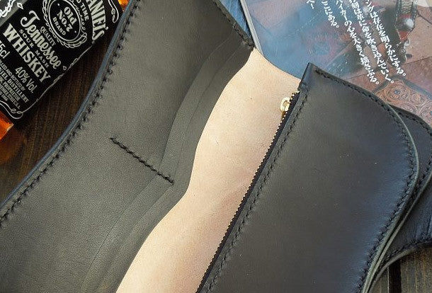 This is handmade natural Italian Vegetable Tanned leather black leather punk long biker wallet trucker wallet chain bifold long wallet for men.The wallet is bifold,color is black.There are 4 full size bill slots/holders,4 ID/credit card slots/holders, 1 zip coin slot/holder and a floral button / vintage icon as its lock catch~Hand-made in the traditional method with punched holes and saddle stitching by hand.