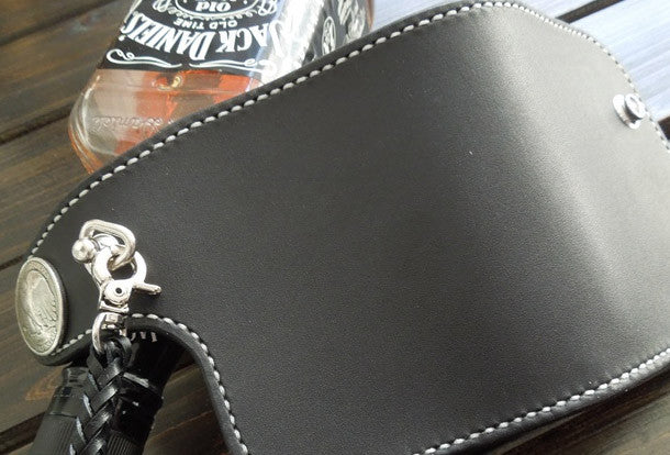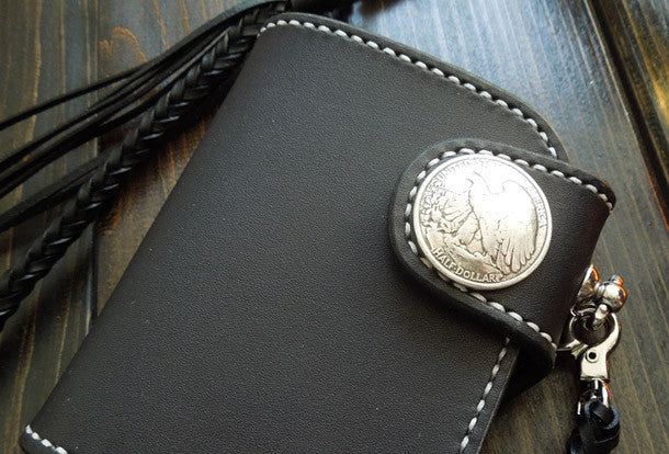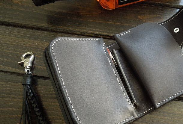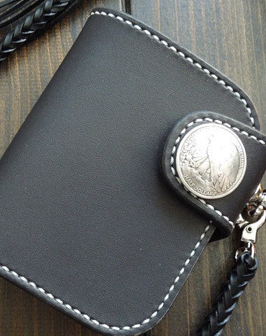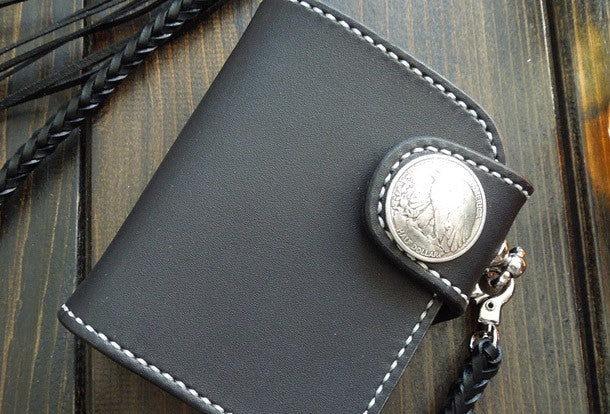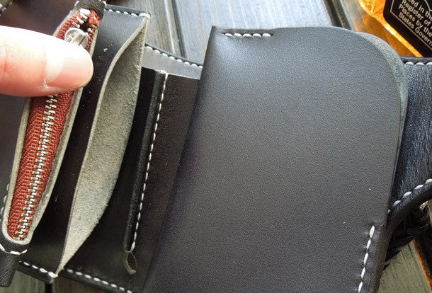 This is Handmade black leather billfold biker wallet chain bifold billfold wallet purse for men.The wallet is bifold,color is black.There are 1 full size bill slots/holders, 2?big ID/credit card slots/holders, 1 big zip coin slot/holder ,and a vintage american icon/floral button as its lock catch~Hand-made in the traditional method with punched holes and saddle stitching by hand.