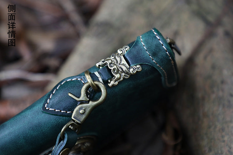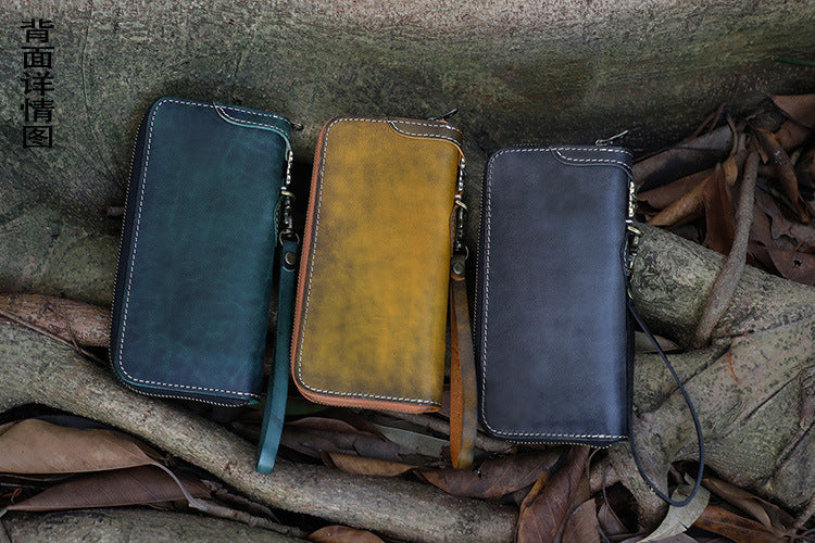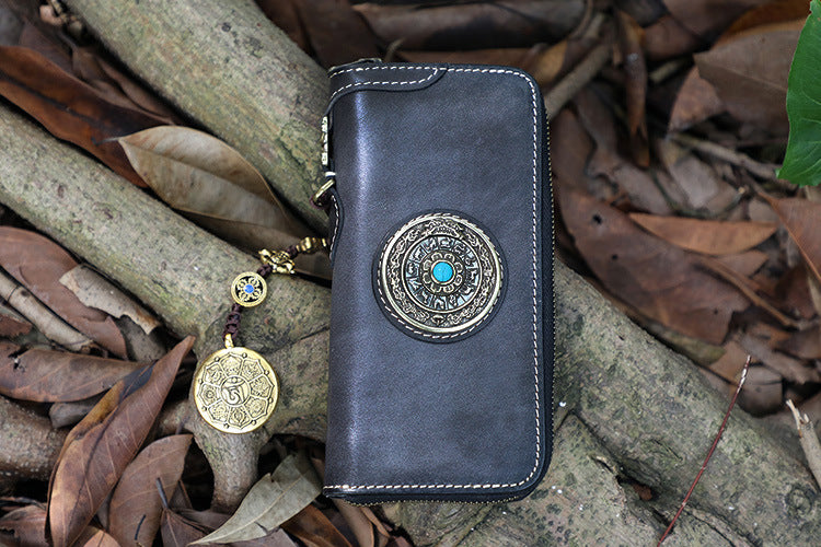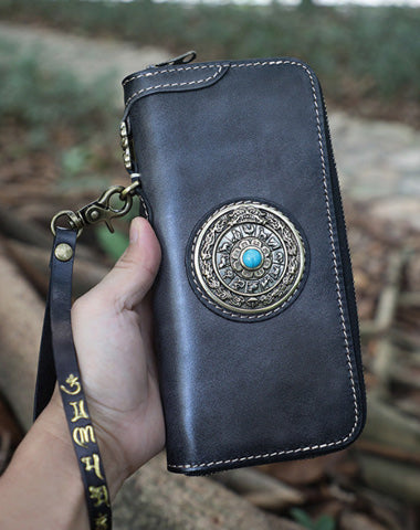 Design: Handmade Leather Tibetan Totem Long Wallet Cool Zipper Clutch Wristlet Wallet for Men