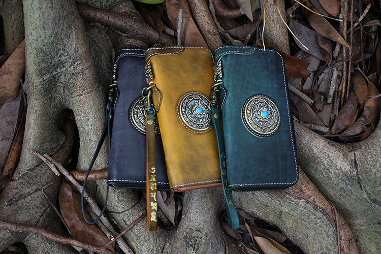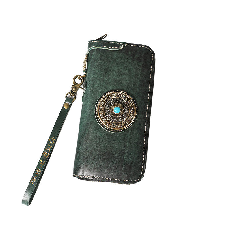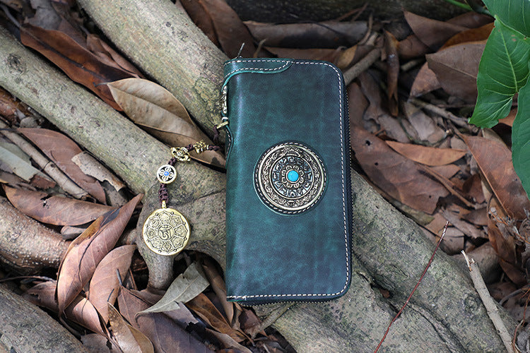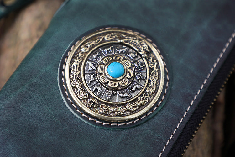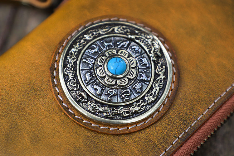 Style: Handmade Leather Tibetan Totem Long Wallet Cool Zipper Clutch Wristlet Wallet for Men