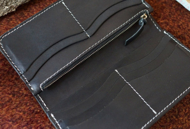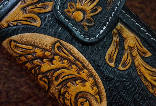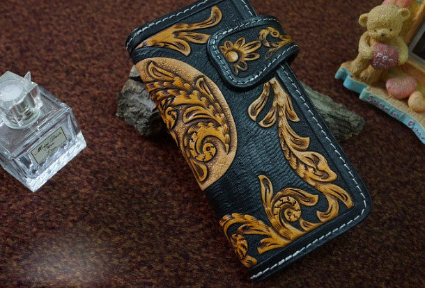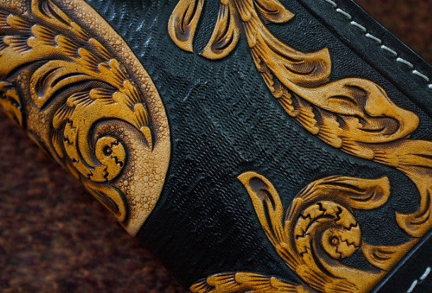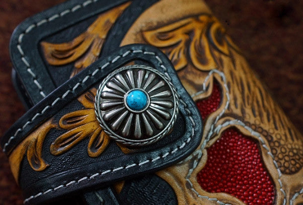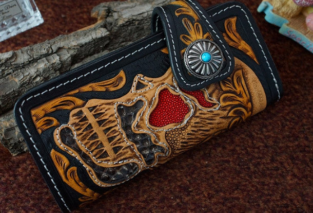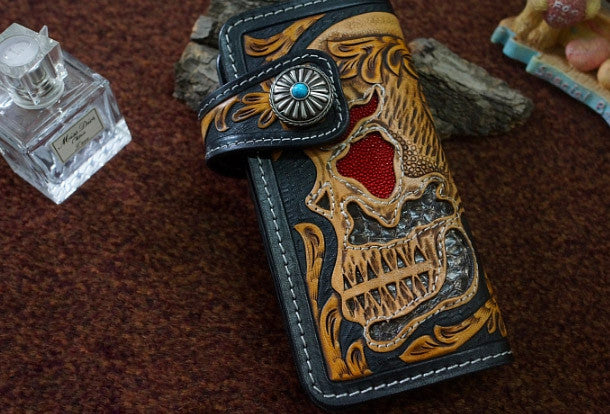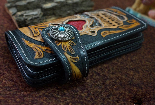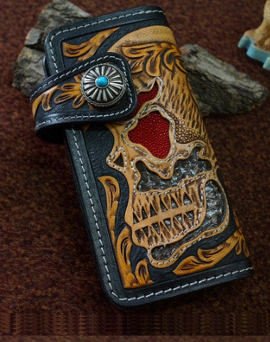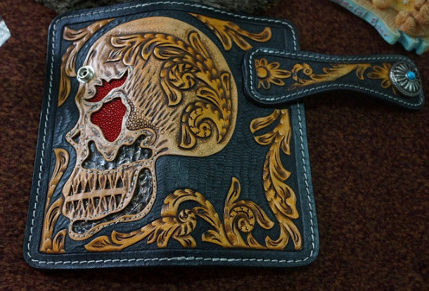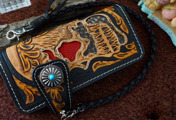 This is handmade black tan?natural Italian Vegetable Tanned leather?snake skin?long punk?skull?carved biker wallet with chain purse clutch for men.The wallet is bifold,color is black&tan.There are 3?full size bill slots/holders, 10?ID/credit card slots/holders,1 zip coin change slot~Hand-made in the traditional method with punched holes and saddle stitching by hand.