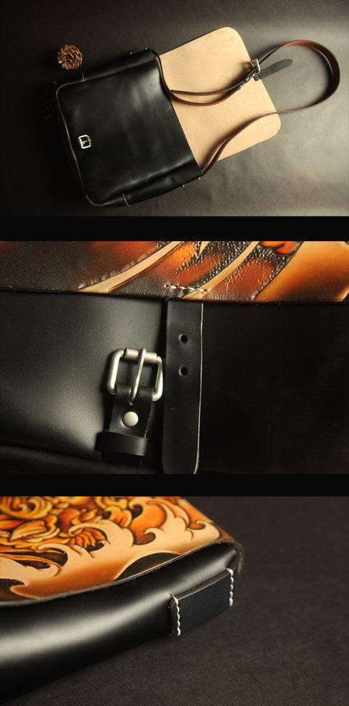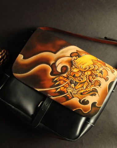 Handmade Black Tooled Chinese Lion Leather Courier Bag Messenger Bag For Men