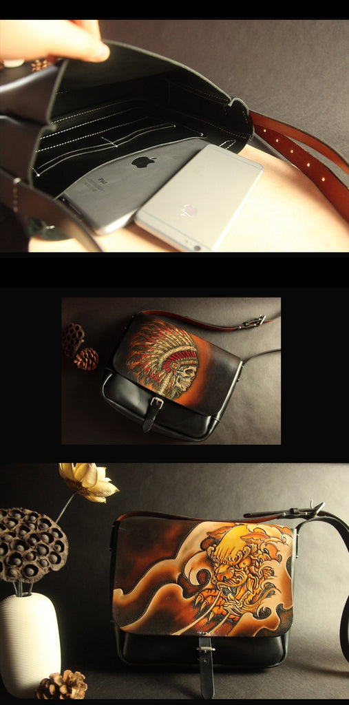 Design: Handmade Black Tooled Indian Chief Skull Leather Courier Bag Messenger Bag For Men