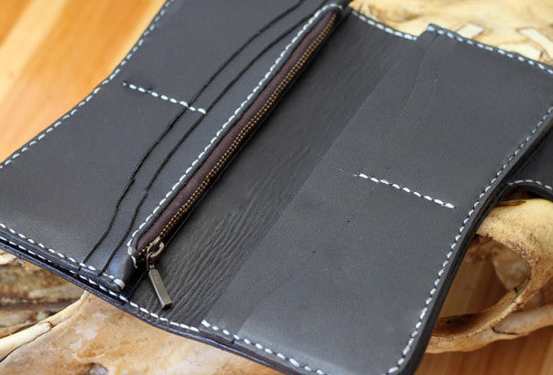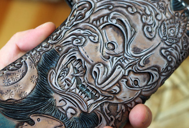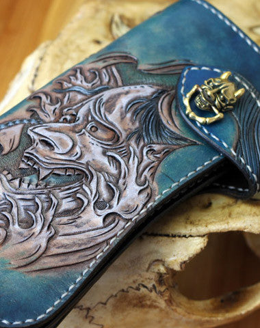 This is handmade blue?natural Italian Vegetable Tanned leather long prajna?carved biker wallet chian?purse clutch for men.The wallet is bifold,color is blue.There are 3?full size bill slots/holders,8 ID/credit card slots/holders,1 coin change slot~Hand-made in the traditional method with punched holes and saddle stitching by hand.