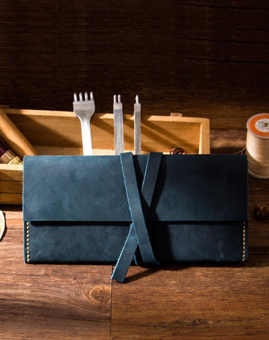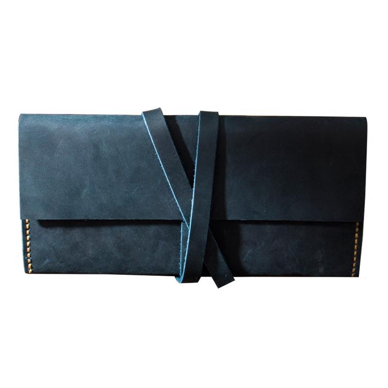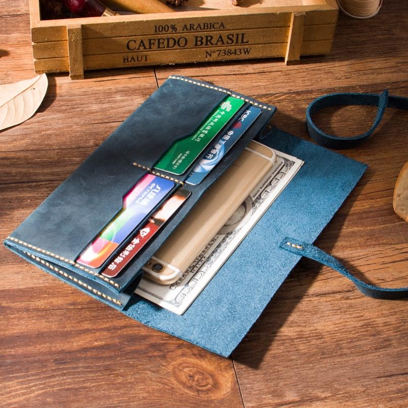 Handmade Blue Leather Womens Long Wallets Personalized Wrap Tie Checkbook Wallet for Men