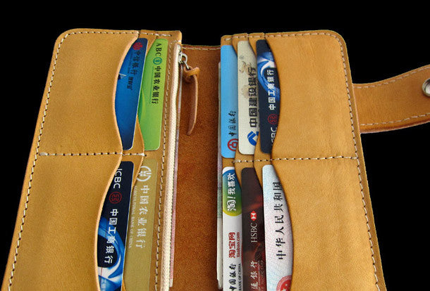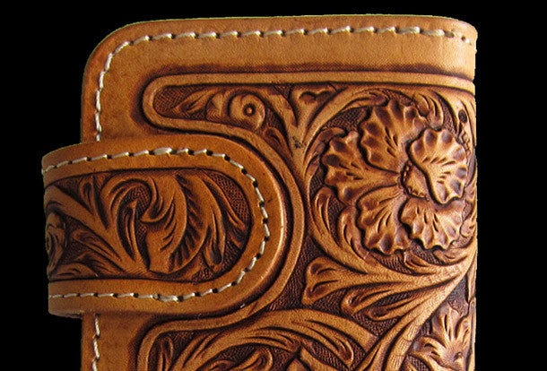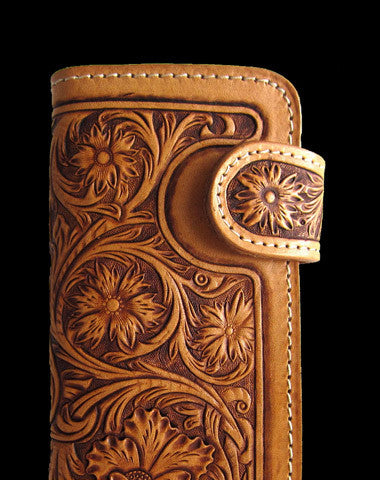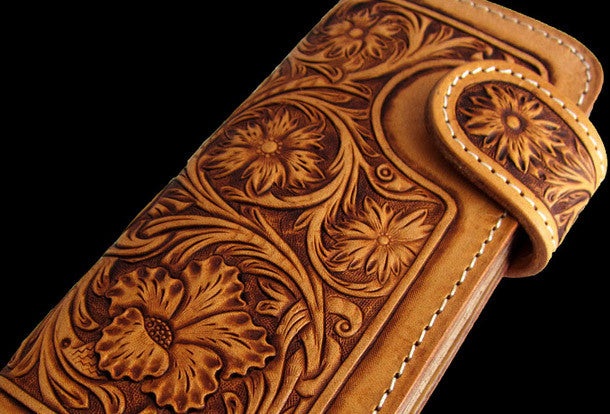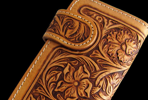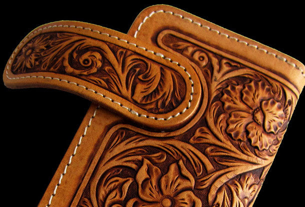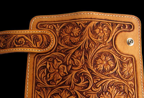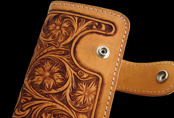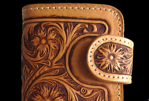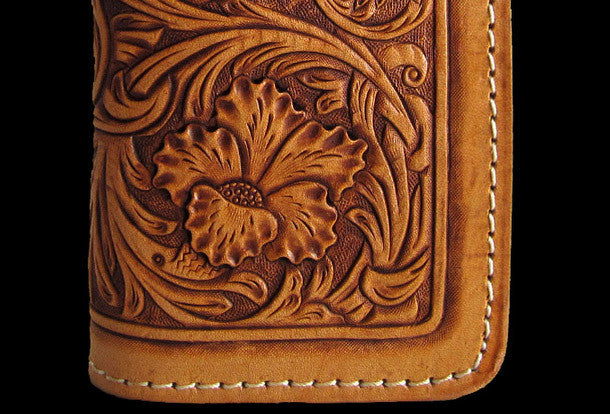 This is handmade brown beige natural Italian Vegetable Tanned leather long floral carved biker wallet purse clutch for men.The wallet is bifold,color is beige.There are 2 full size bill slots/holders, 10 ID/credit card slots/holders,1 zip coin change slot~Hand-made in the traditional method with punched holes and saddle stitching by hand.
