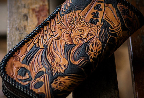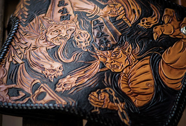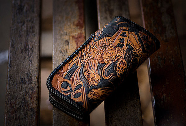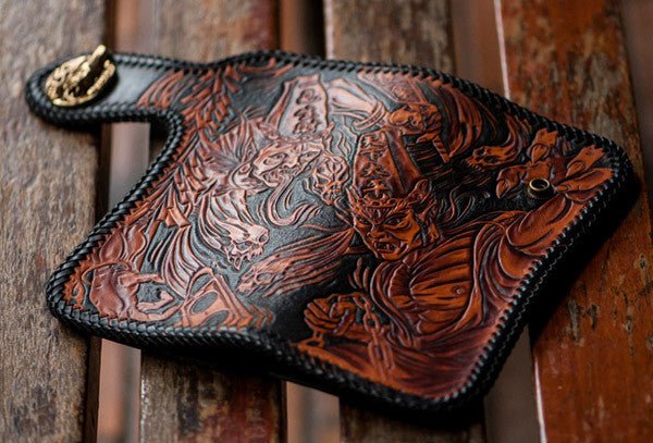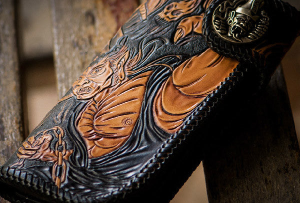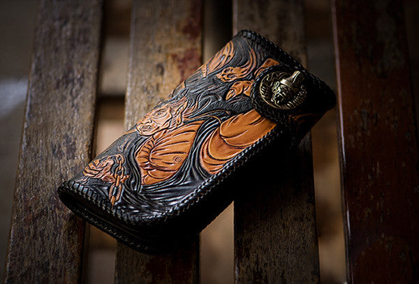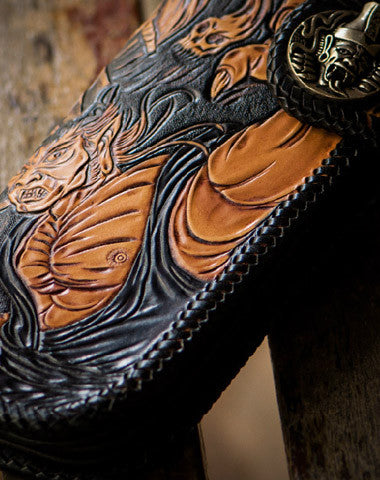This is handmade black brown coffee natural Italian Vegetable Tanned leather long Black and white variable carved biker wallet purse clutch for men.The wallet is bifold,color is black&a