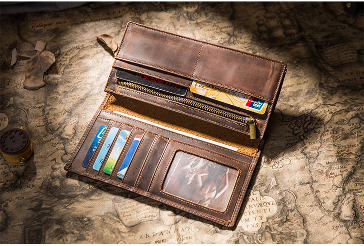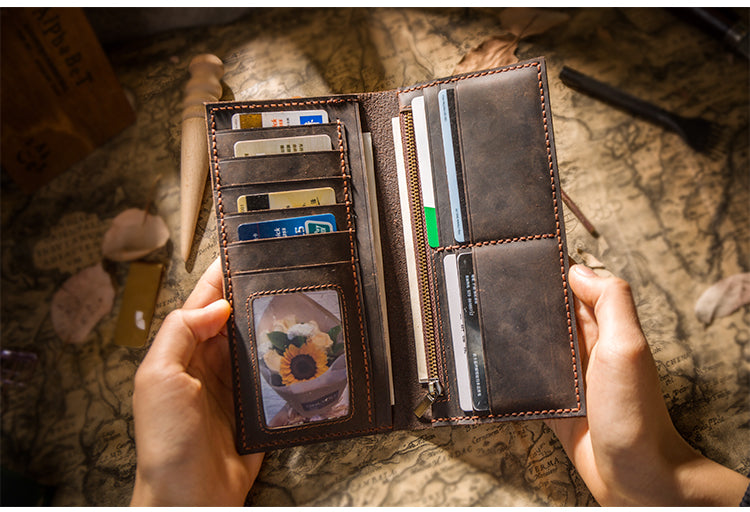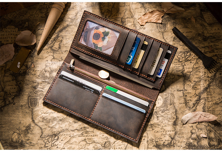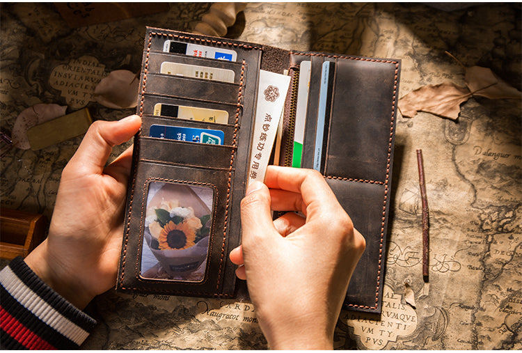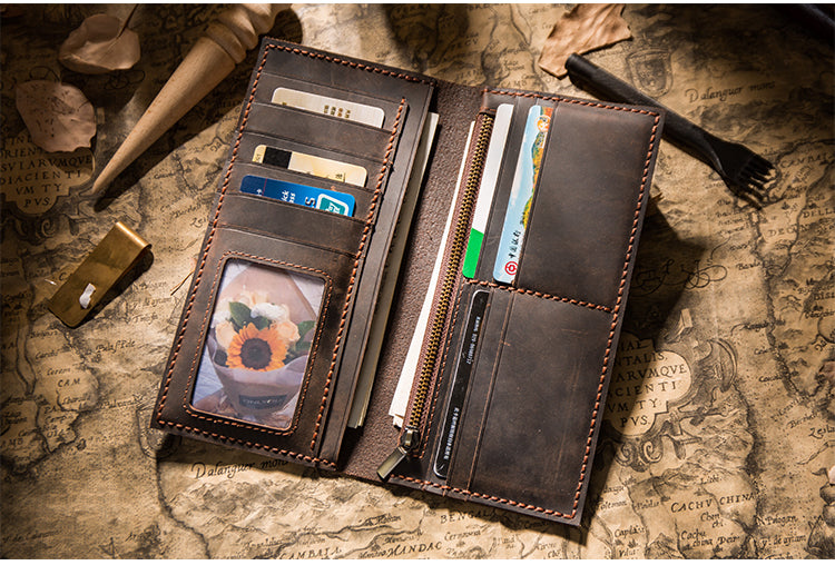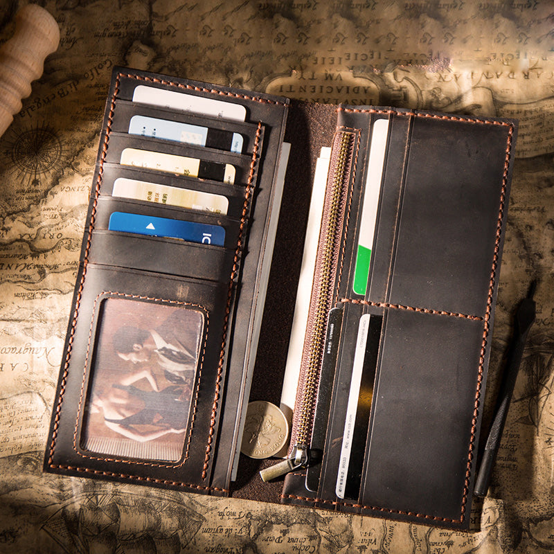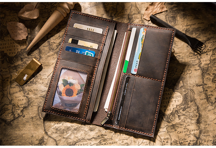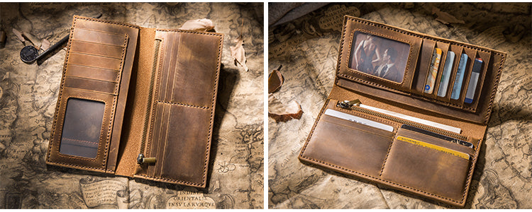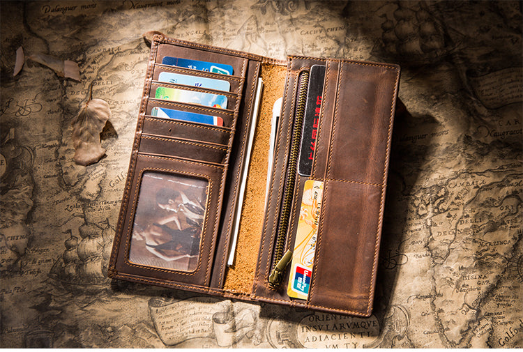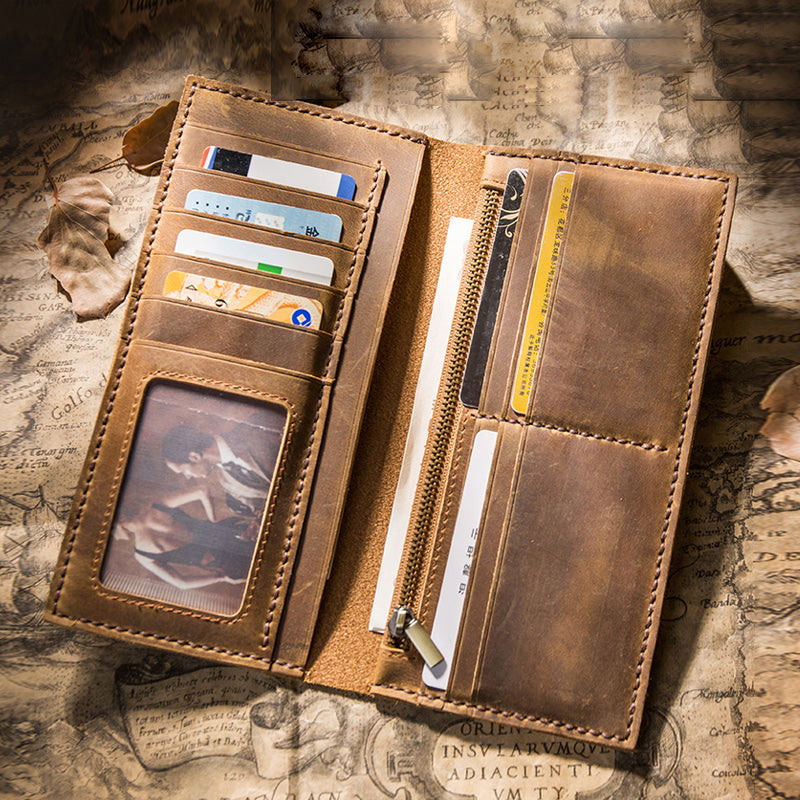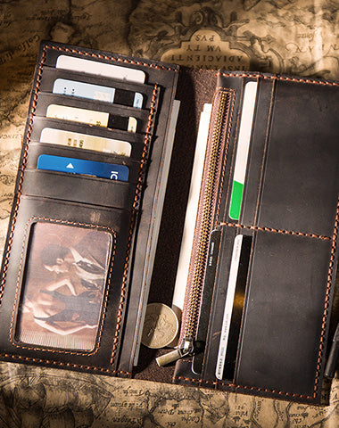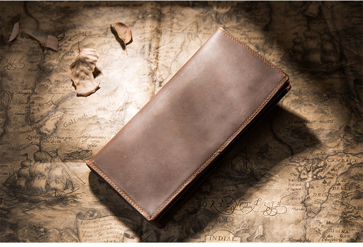 Design: Handmade Brown Leather Long Wallet Bifold Multi Cards Checkbook Wallet for Men