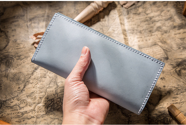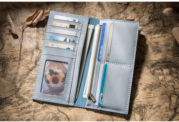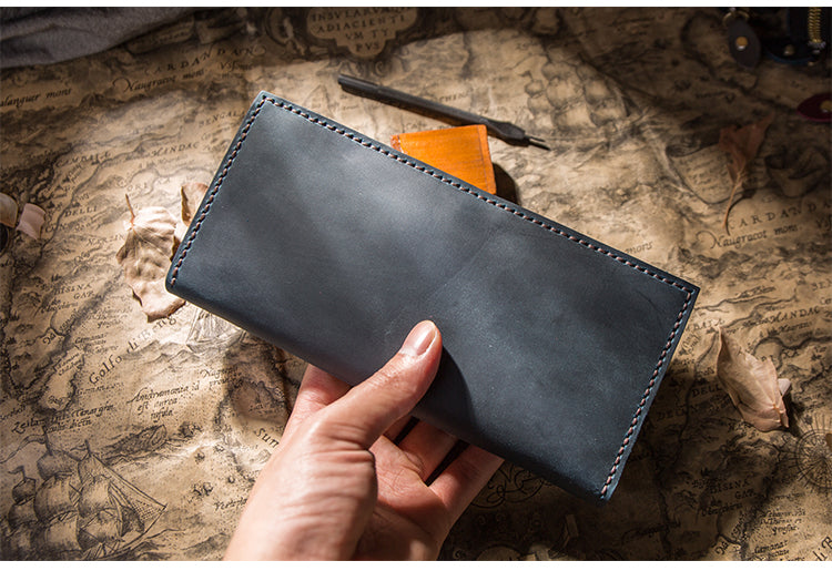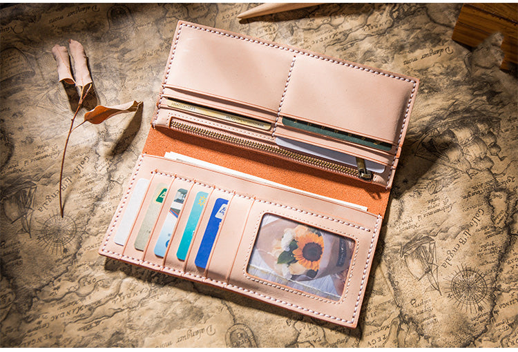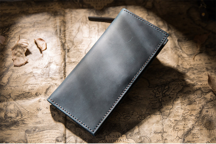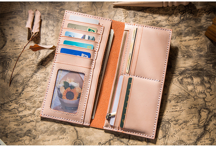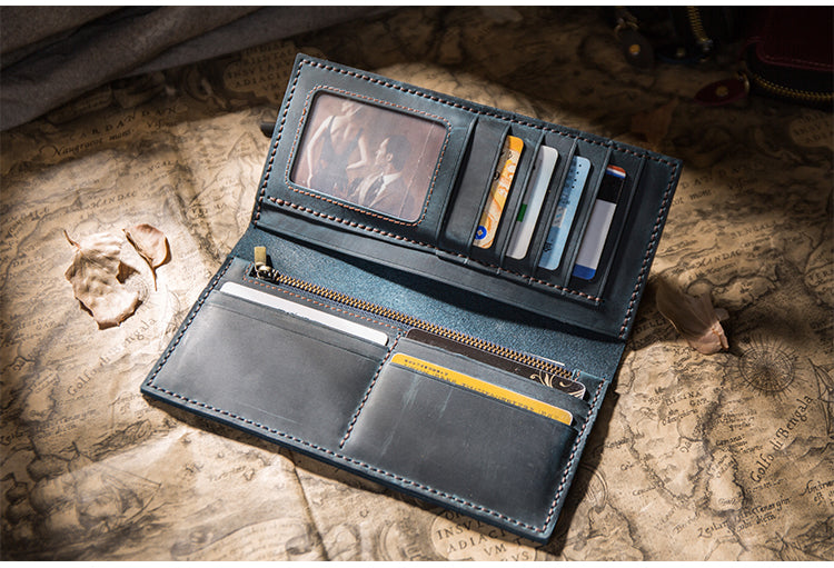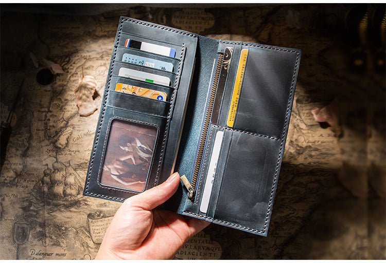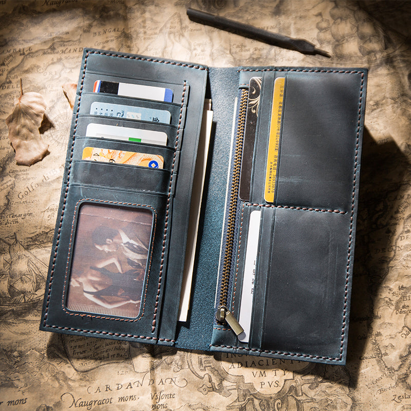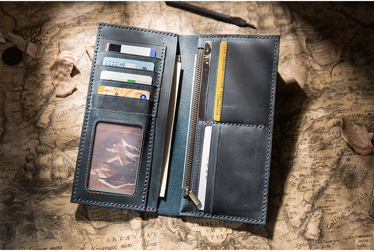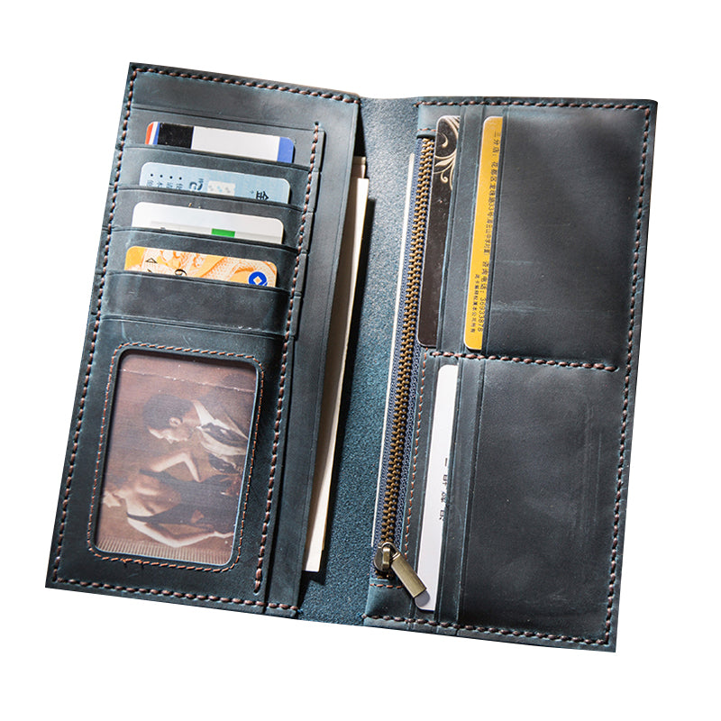 Design: Handmade Brown Leather Long Wallet Bifold Multi Cards Checkbook Wallet for Men