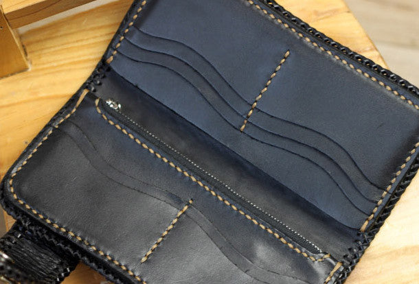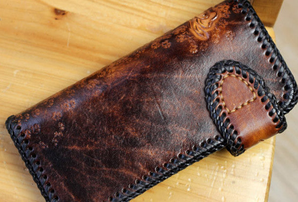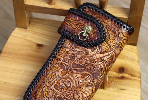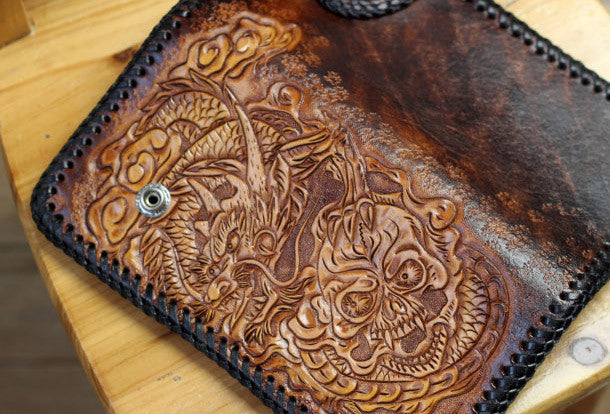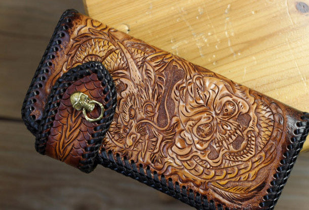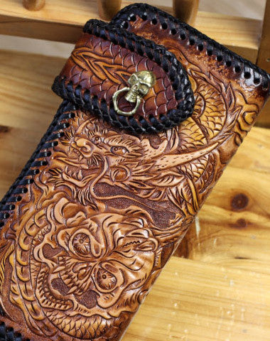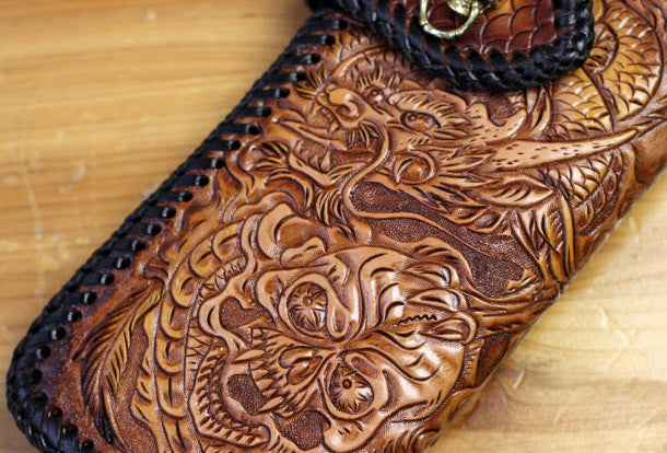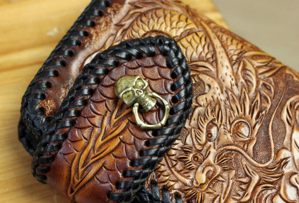 This is handmade brown?natural Italian Vegetable Tanned leather long Skull dragon carved biker wallet chian?purse clutch for men.The wallet is bifold,color is brown.There are 3?full size bill slots/holders,10 ID/credit card slots/holders,1 coin change slot~Hand-made in the traditional method with punched holes and saddle stitching by hand.