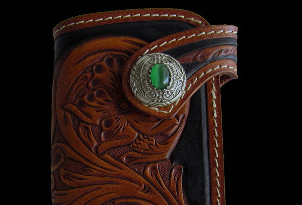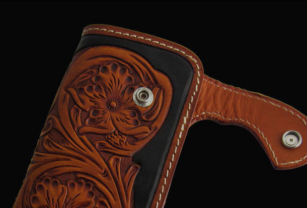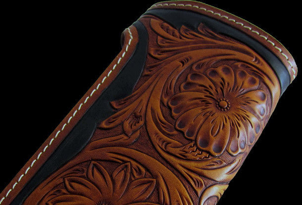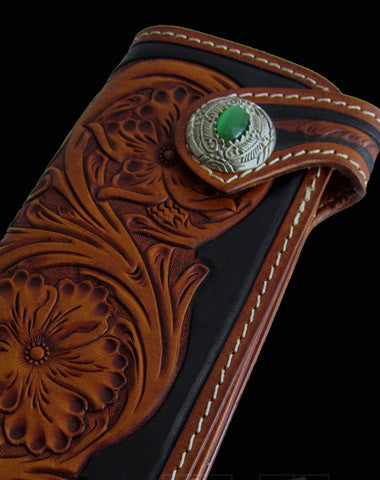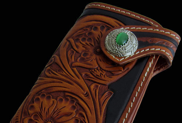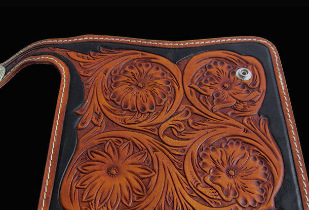 This is handmade black?coffee natural Italian Vegetable Tanned leather long floral carved biker wallet purse clutch for men.The wallet is bifold,color is black&coffee.There are 2?full size bill slots/holders, 12?ID/credit card slots/holders,2 zip coin change slot~Hand-made in the traditional method with punched holes and saddle stitching by hand.