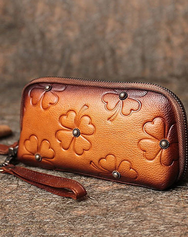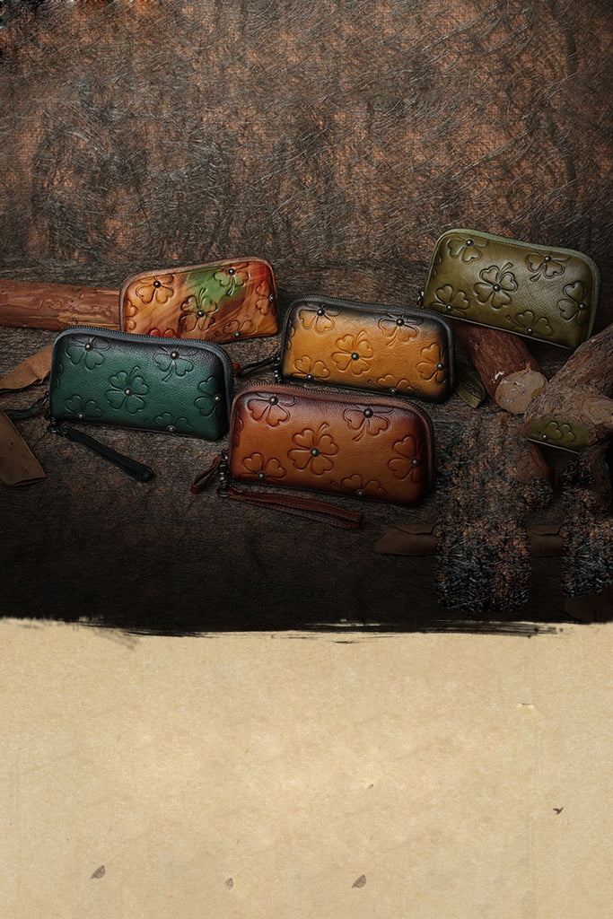 Design: Handmade Clover Leather Wristlet Wallets Womens Zip Around Wallet Ladies Cute Clutch Wallet for Women