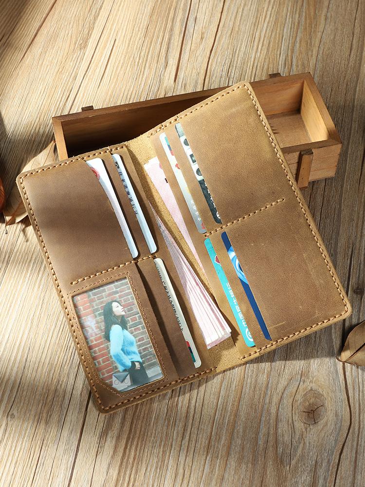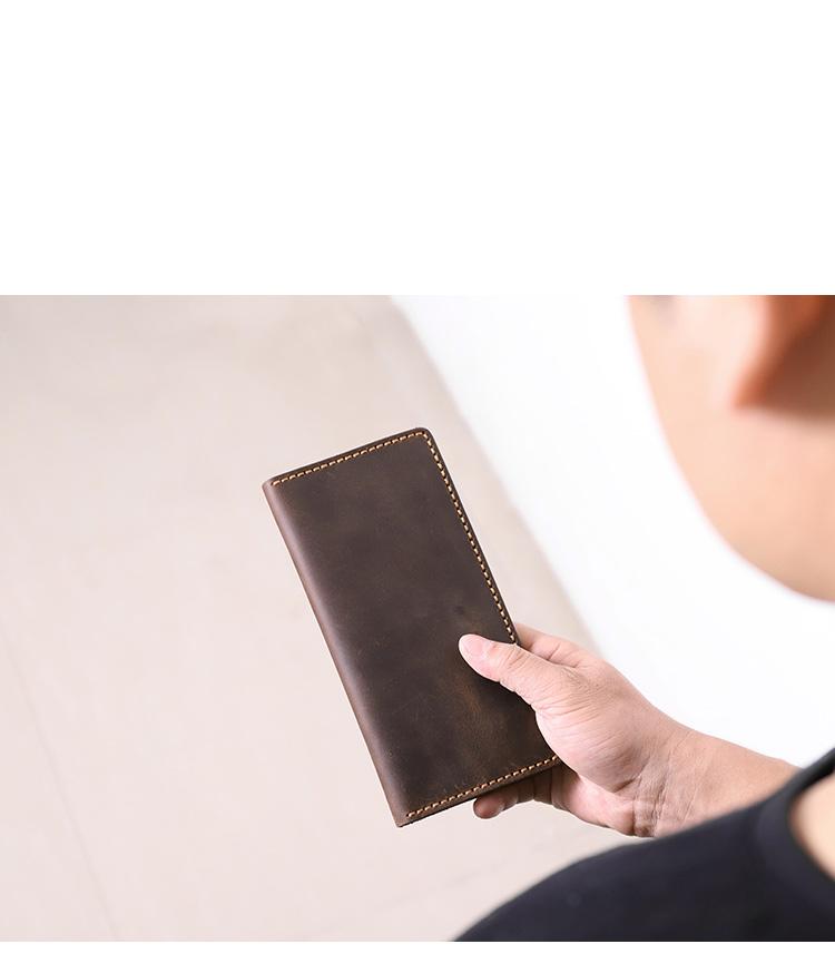 Handmade Coffee Leather Mens Bifold Long Wallet Personalized Coffee Checkbook Wallets for Men