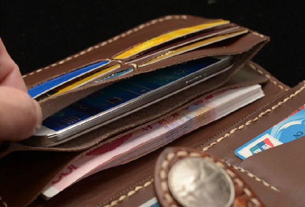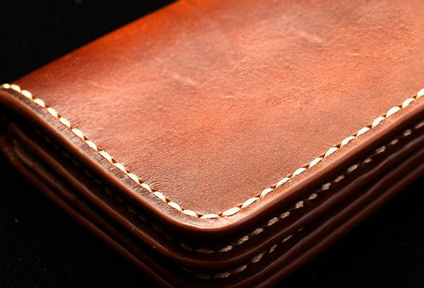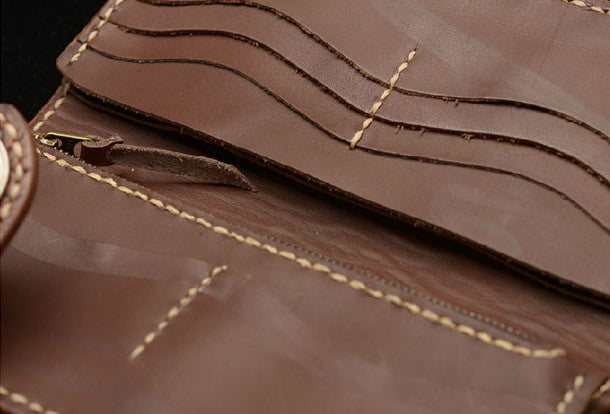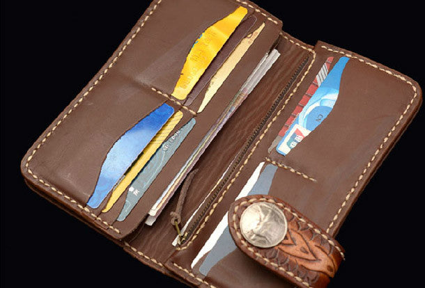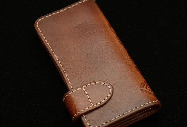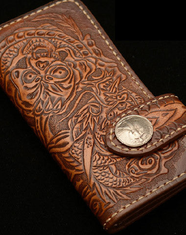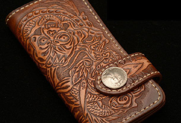 This is handmade coffee natural Italian Vegetable Tanned leather long Skull dragon carved biker wallet chian?purse clutch for men.The wallet is bifold,color is coffee.There are 3?full size bill slots/holders,10 ID/credit card slots/holders,1 zip coin change slot~Hand-made in the traditional method with punched holes and saddle stitching by hand.