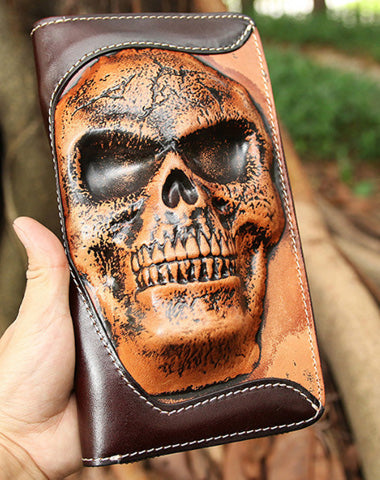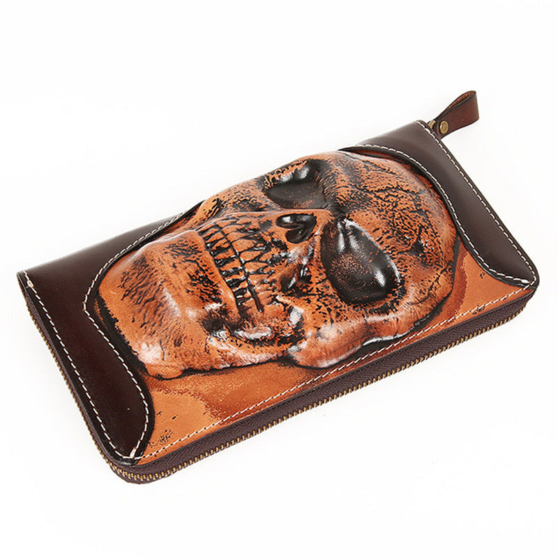 Design: Handmade Leather Tooled Relief Skull Long Wallet Cool Skull Zipper Clutch Wristlet Wallet for Men