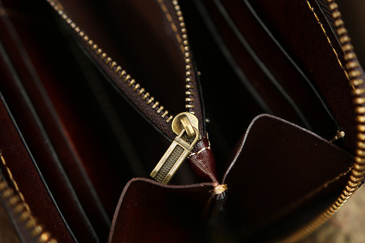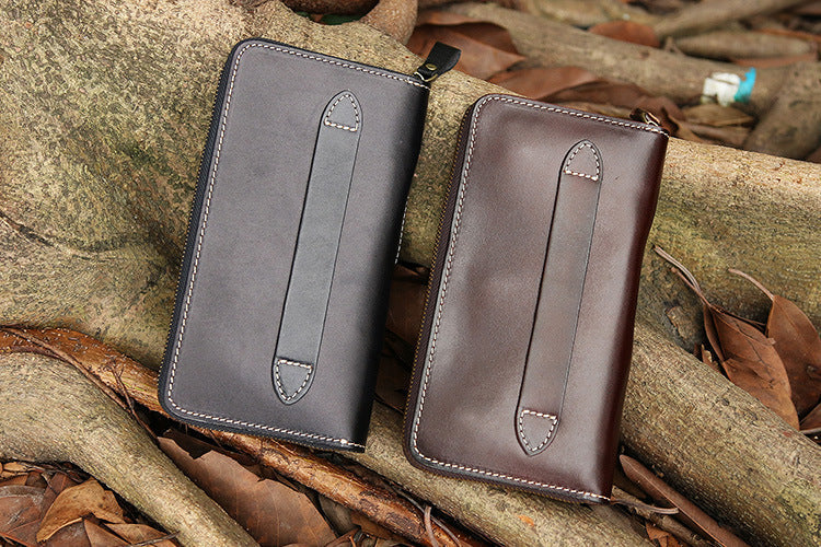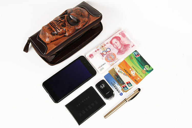 Style: Handmade Leather Tooled Relief Skull Long Wallet Cool Skull Zipper Clutch Wristlet Wallet for Men