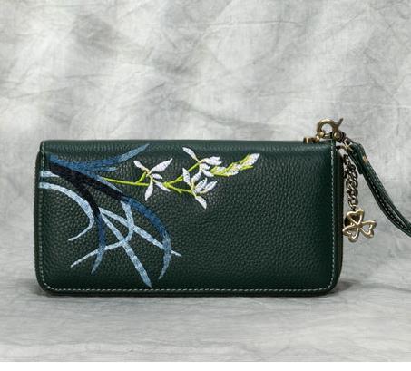 Style: Handmade Embroidery Black Leather Orchids Wristlet Wallet Womens Zip Around Wallets Flowers Orchids Ladies Zipper Clutch Wallet for Women