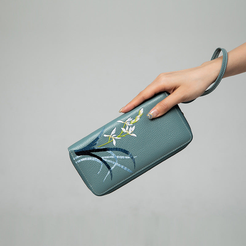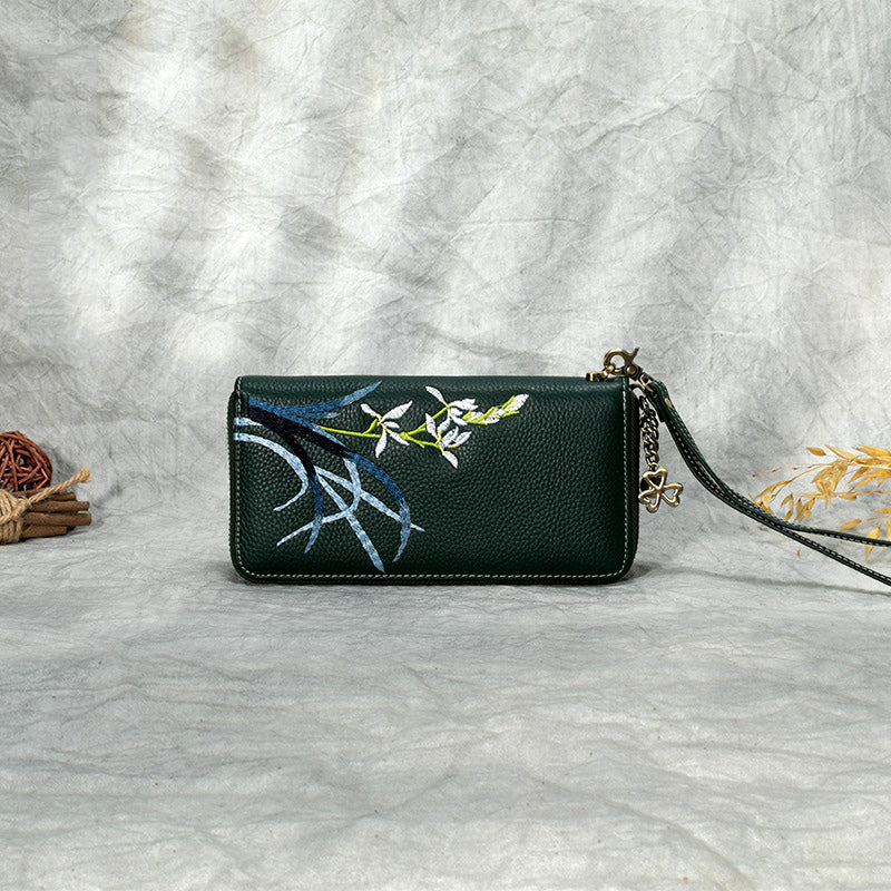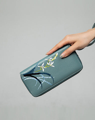 Style: Handmade Embroidery Gray Leather Orchids Wristlet Wallet Womens Zip Around Wallets Flowers Orchids Ladies Zipper Clutch Wallet for Women